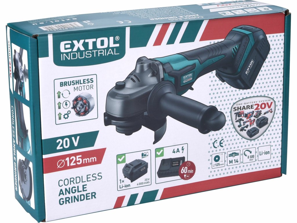 Brúska uhlová akumulátorová Share 20V, 125mm, bezuhlíkový motor, 1x 4Ah Li-ion, 2,4A nabíjačka, M14,