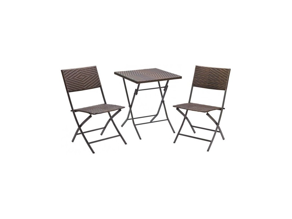 Sklápací nábytok vhodný na balkón alebo terasu, kovová konštrukcia, umývateľný polyratanový poťah, set obsahuje 2 stoličky + 1 stôl. Dodáva sa komplet zmontovaný.