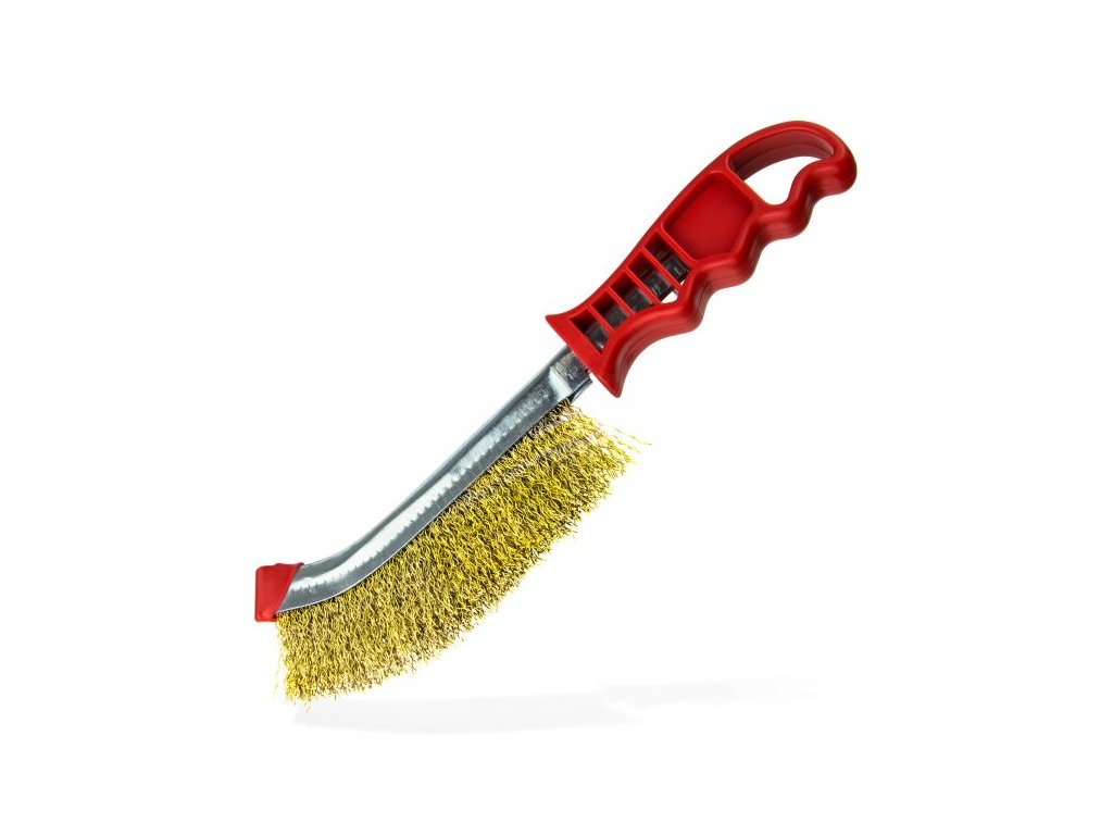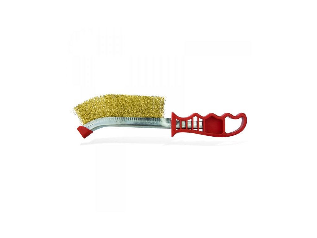 Bronzová drôtená kefa s plastovou rukoväťou, ideálna napríklad na čistenie brzdových systémov, hrdzavých predmetov, na zdrsnenie povrchov a pod. Vybavenie: