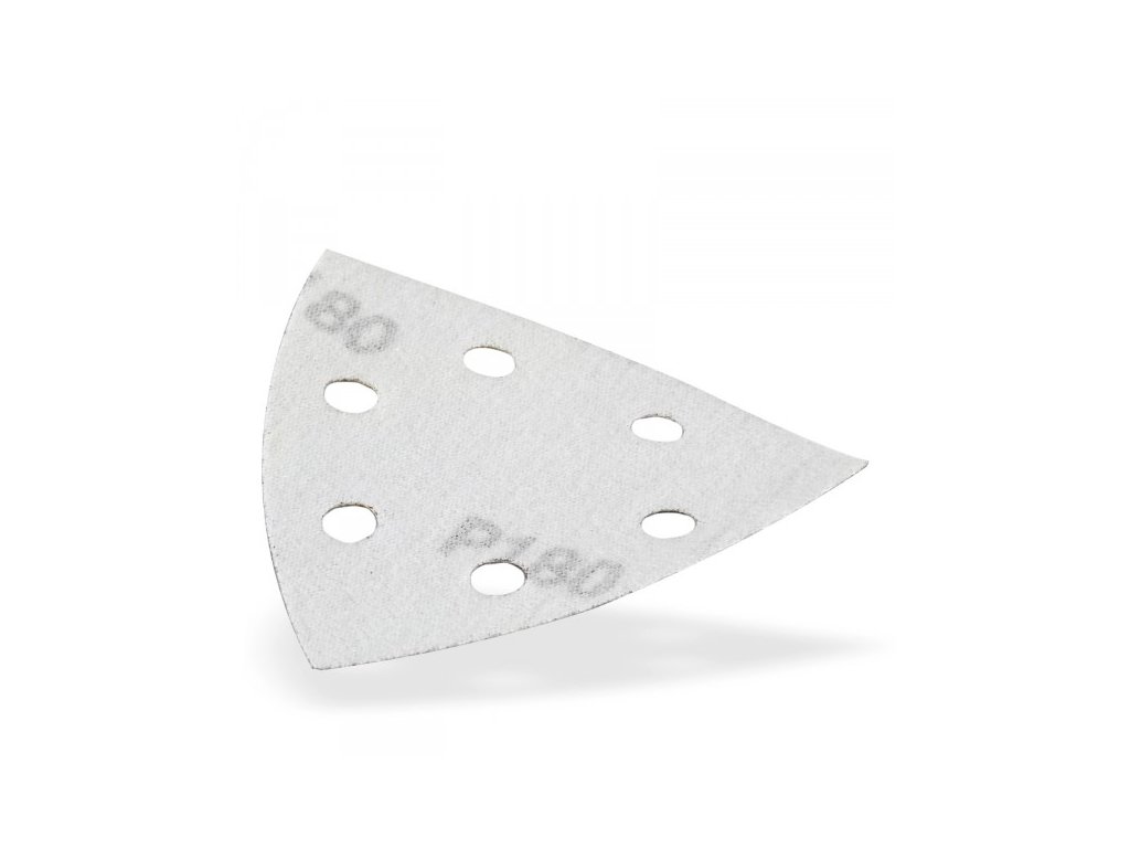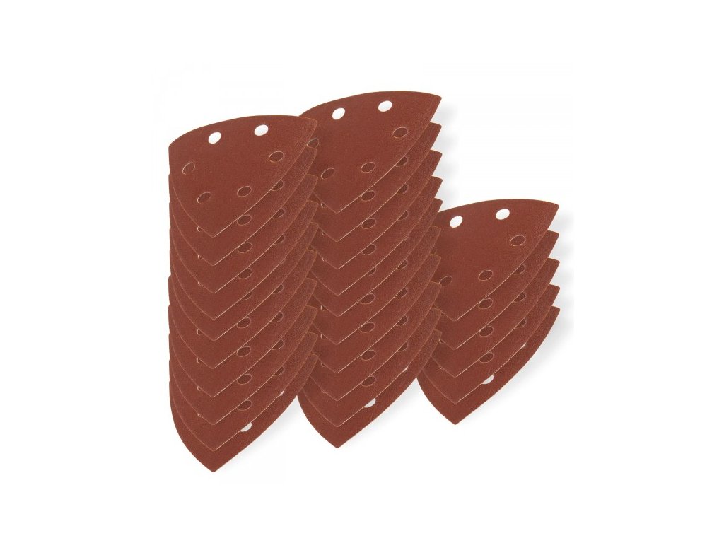 Sada brúsnych papierov K180 na delta brúsky. Čisté brúsenie dreva, náterov, plastov, kovu. Vhodné pre delta brúsky s dierovaním / bez dierovania, uchytenie pomocou suchého zipsu. Brúsny papier pre delta brúsku K180, 25 ks