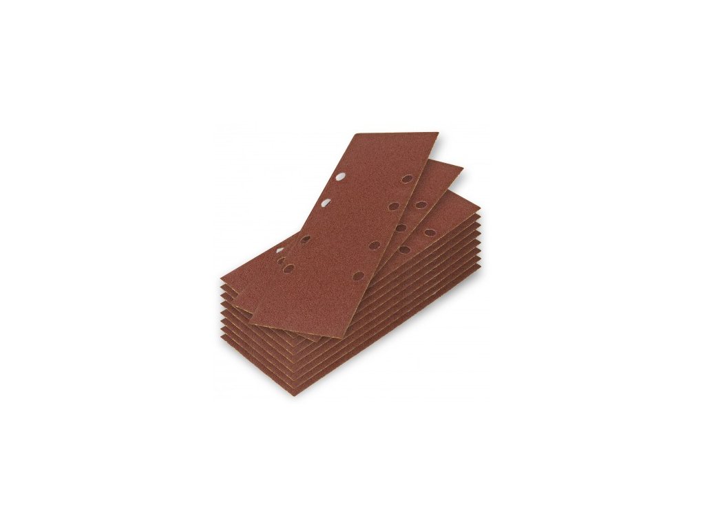 Brúsny papier pre vibračné brúsky s dierovaním alebo bez dierovania, na brúsenie dreva, náterov, plastov, kovov a iných materiálov. Uchytenie upnutím bez suchého zipsu alebo lepiacej vrstvy. V balení 10 ks.