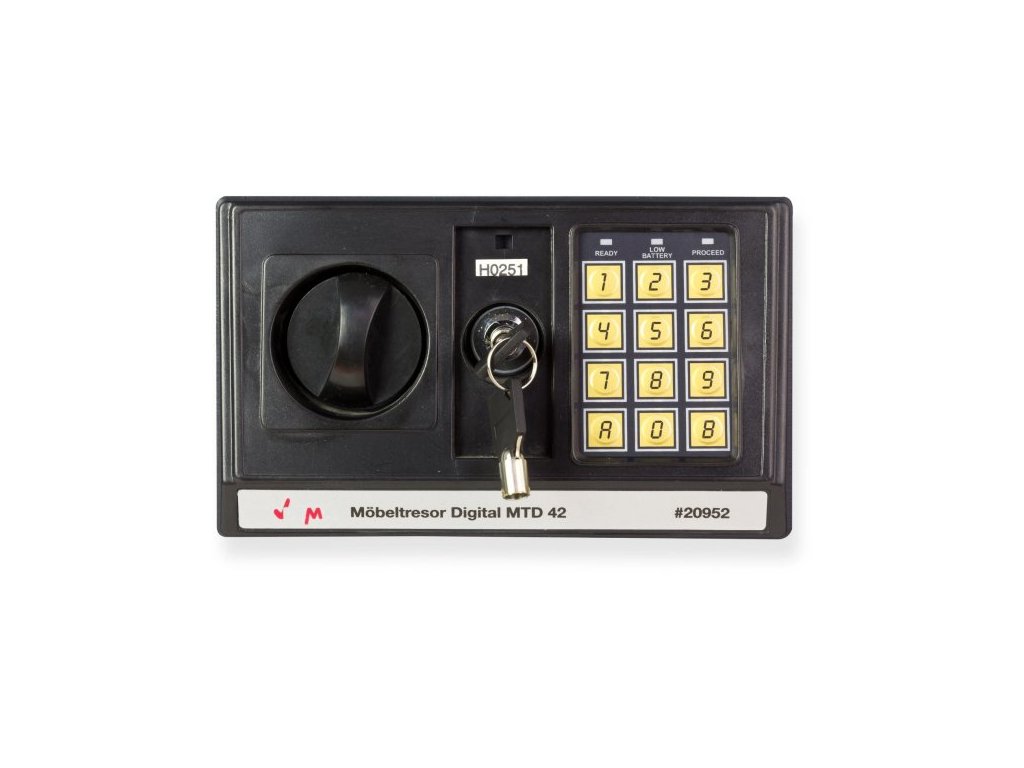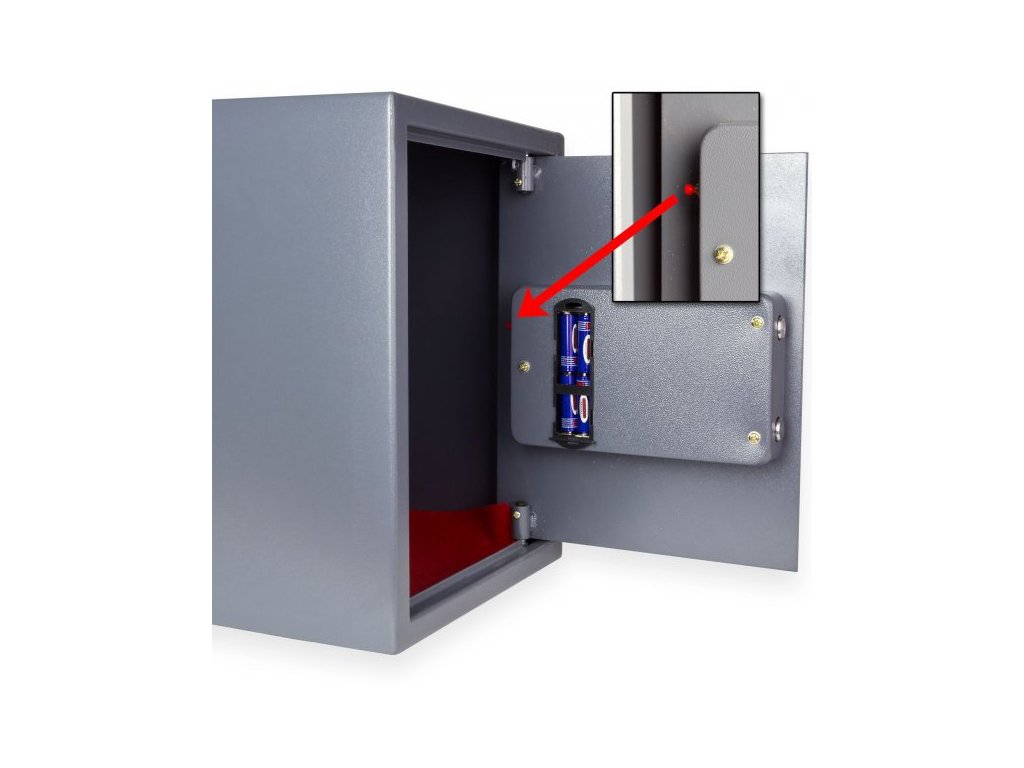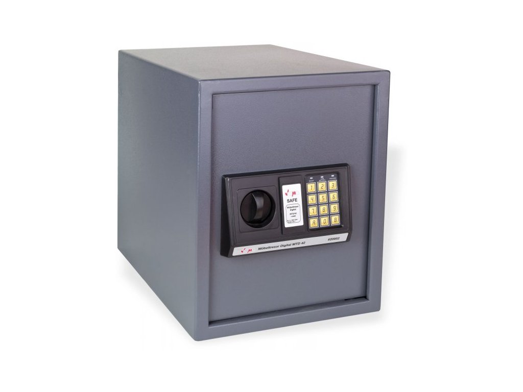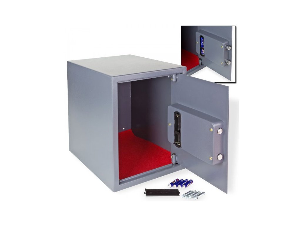 Trezor v masívnom a kvalitnom spracovaní, mechanicko – elektrický systém uzamykania s dvoma skrutkami s kombinovaným zámkom a bezpečnostným okrúhlym kľúčom (pre prípad zabudnutia kódu), veľký vnútorný priestor, s možnosťou digitálneho aj manuálneho zamykania. Digitálny trezor 30x37x38 cm 42 litrov