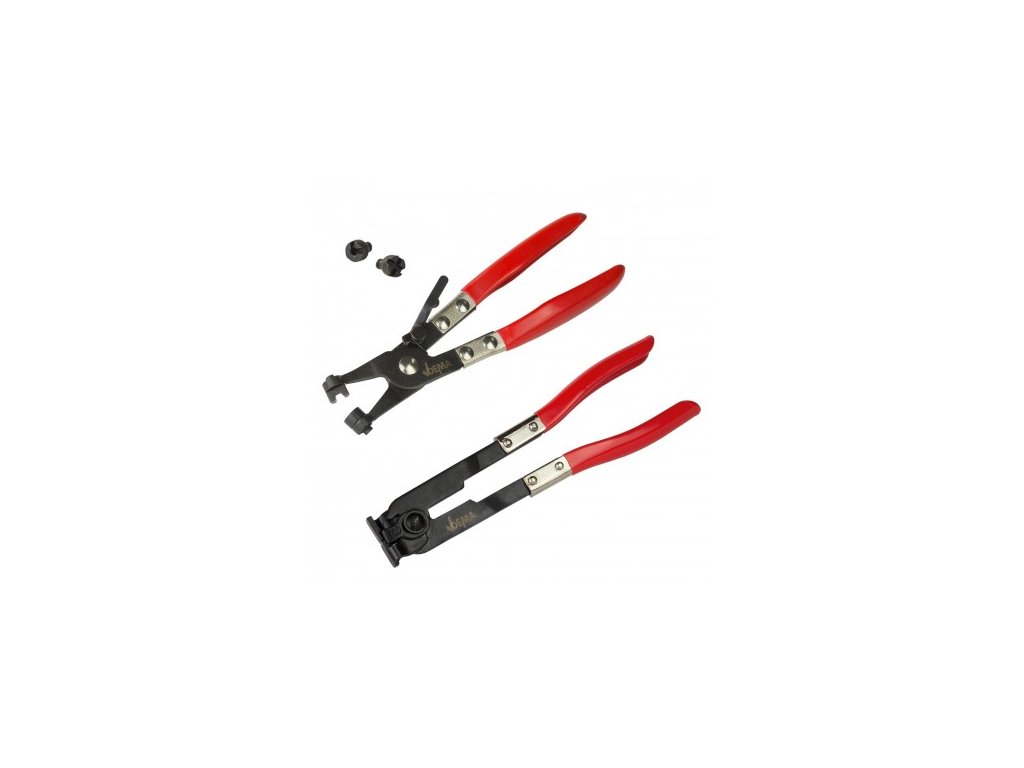 Sada klieští na hadicové spony a klieští na manžety pre montovanie hadicovej spony na manžety, chladiče, filtre a palivové potrubia. Kovové prevedenie, s protišmykovými rukoväťami pre bezpečnú prácu, pridržiavačom (proti uvoľneniu manžetového spoja), špeciálne kalenými čeľusťami. Kliešte na hadicové spony a kliešte na manžety