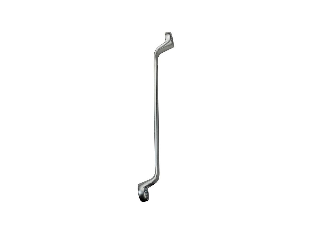 Dvojitý prstencový kľúč z chróm-vanádiovej ocele. Hĺbkovo zalomené prevedenie, pochrómovaný povrch.
