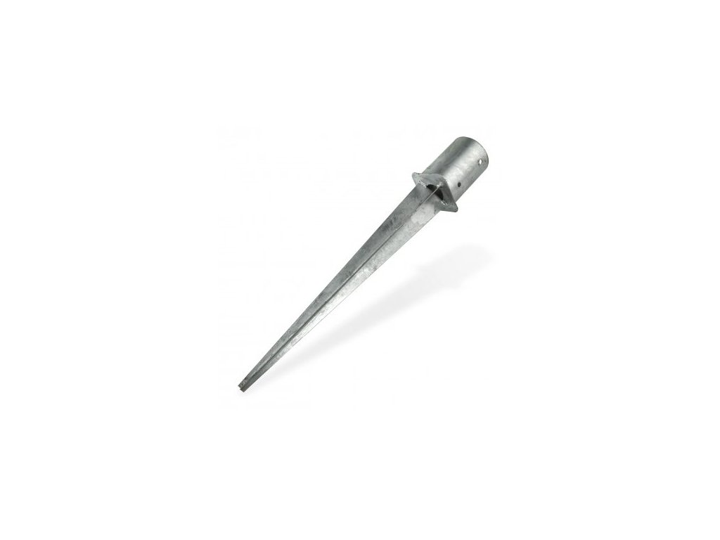 Zemný klin s kruhovým priemerom, ideálny na použitie pri stavbe plotov, palisád, v záhradách, na terasách, pozinkovaný, so 4 otvormi pre priečne upevnenie, vhodný pre stĺpiky s priemerom 100 mm.