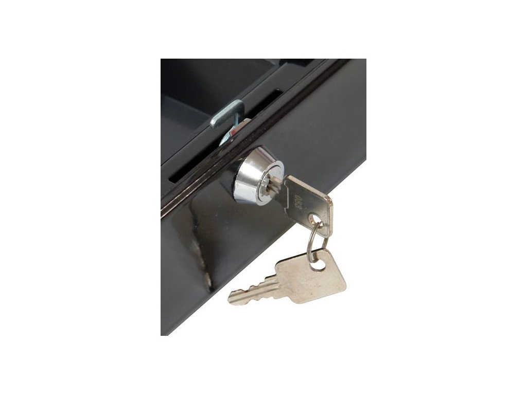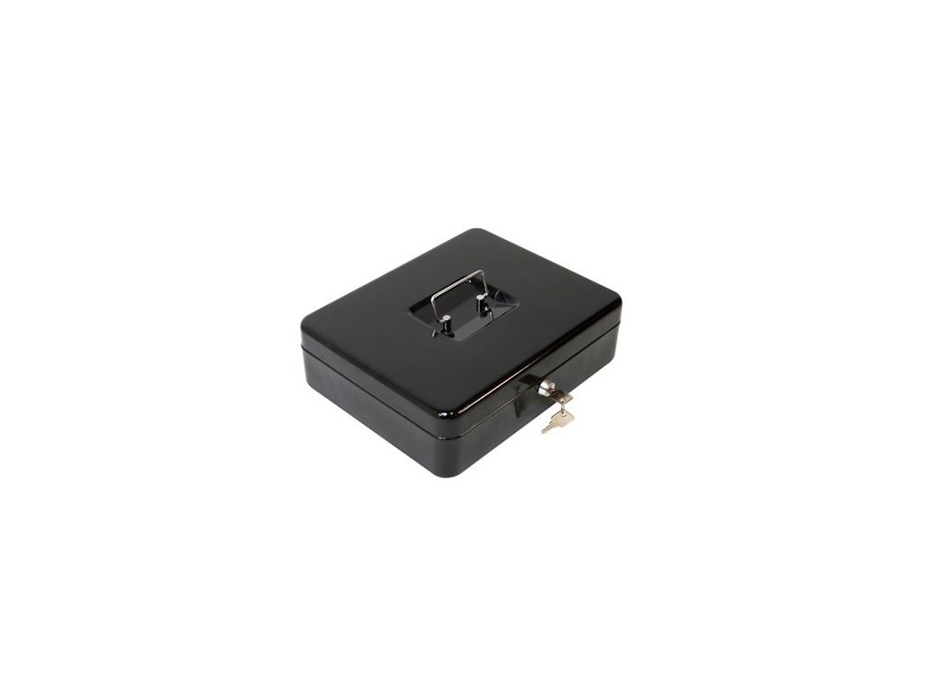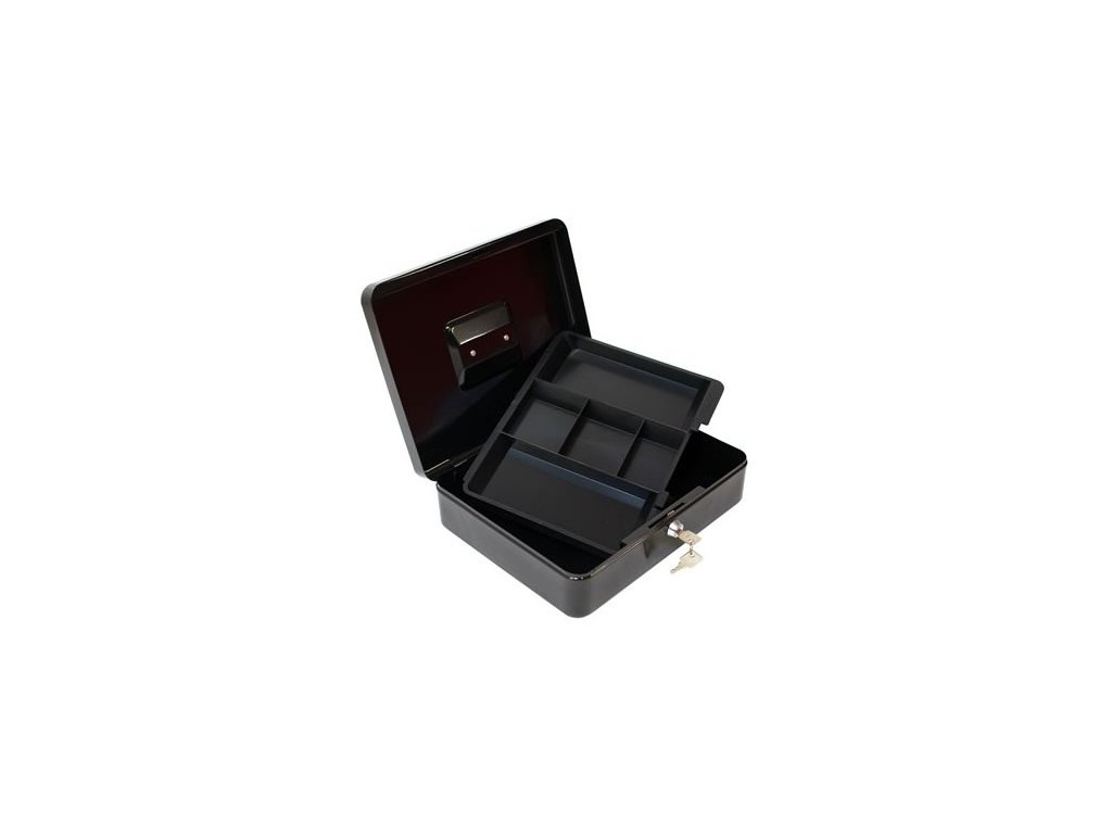 Pokladnička pre bezpečné uchovanie mincí a bankoviek, dokumentov. Cylindrický zámok s dvoma kľúčmi, praktické držadlo, plastová priehradka na mince, ktorá je vyberateľná. Zaoblené rohy. Materiál: kov