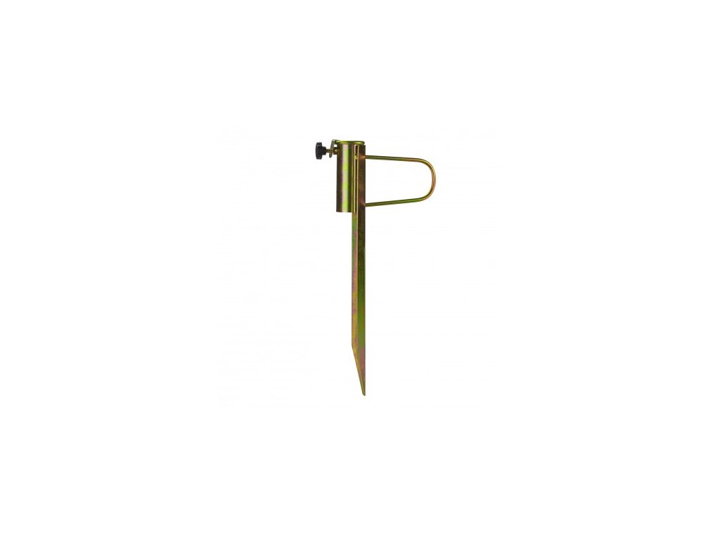 Kovový stojan na slnečník s hrotom na zapichnutie do zeme a nožnou úchytkou bezpečne udrží slnečník alebo dáždnik vo zvislej polohe. Pre lepšiu montáž do zeme je tento stojan vybavený nožnou úchytkou, ktorú možno použiť aj na dodatočné zaistenie slnečníka alebo ako držiak na vodidlo pre psov. Po použití sa dá rýchlo uskladniť a nezaberie pritom veľa miesta. Upnutie je vhodné na dáždniky s priemerom hlavnej tyče od 30 do 38 mm. Galvanizovaný žltý kov, praktická skrutka s ryhovanou hlavou na dotiahnutie a uvoľnenie bez použitia náradia, dlhý hrot na zapichnutie do zeme.