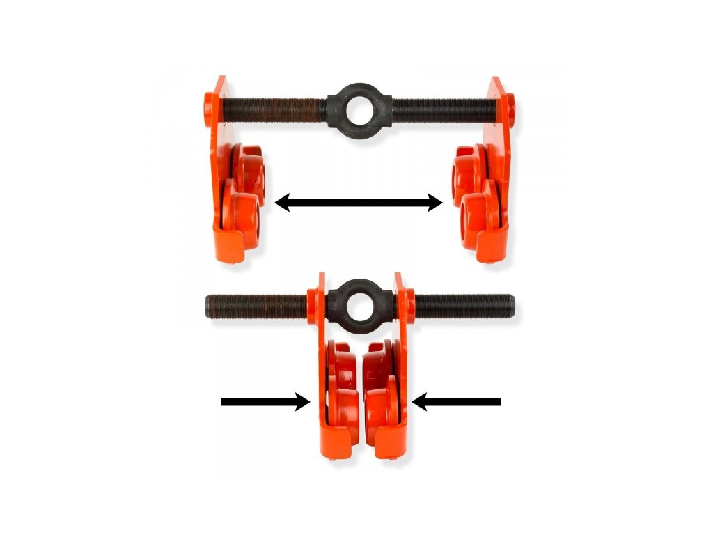 Ťažká konštrukcia, pojazdné kladky s guľôčkovými ložiskami. Jednoduché nastavenie na šírku príruby cez os, protismerné závity na presné justovanie. Univerzálne a efektívne využitie v dielni.