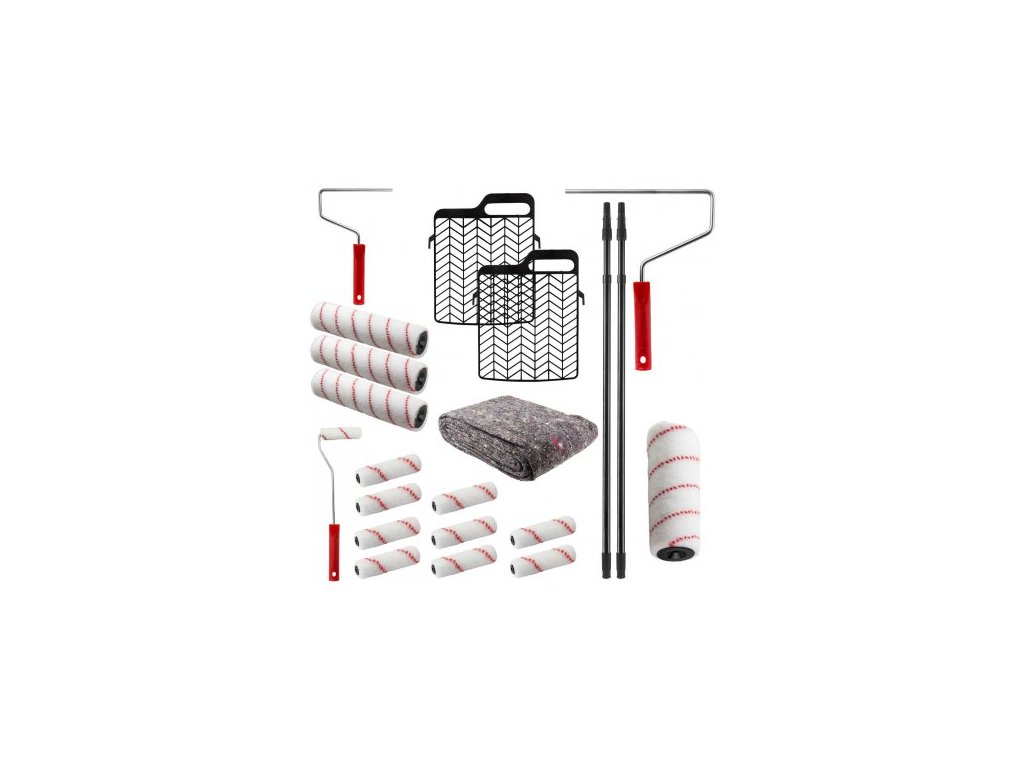 Sada maliarskych valčekov, vhodných na nanášanie rôznych typov farieb, napr. fasádnych, disperzných, interiérových, latexových a pod. Nie je určené na nanášanie lakov. Sada obsahuje: 14 valčekov, 3 rukoväte, 2 mriežky, 2 teleskopické násady, 1 maliarsky vlies. 3 x nylonový valček 25 cm, červený prúžok