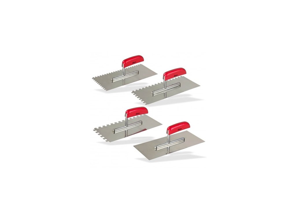 Murárske hladidlá na nanášanie malty, omietky, lepidla, pri murárskych a renovačných prácach, škárovaní a podobne. Ergonomicky tvarovaná drevená rukoväť, leštená nehrdzavejúca oceľ. Murárske hladidlo ozubené/neozubené, 4-dielna sada