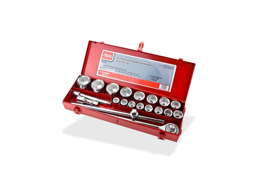 Súprava šesťhranných nástrčkových kľúčov z ocele s 3/4" upínaním. Rukoväť račne s protišmykovou úpravou. Všetky použiteľné nástavce nástrčkových kľúčov s drážkou sa dajú bezpečne zablokovať. Račňa sa nastavuje na pravý/ľavý chod otočným prepínačom na hlave. Uložené v praktickom uzamykateľnom (visiaci zámok nie je súčasťou balenia) kufríku z oceľového plechu.