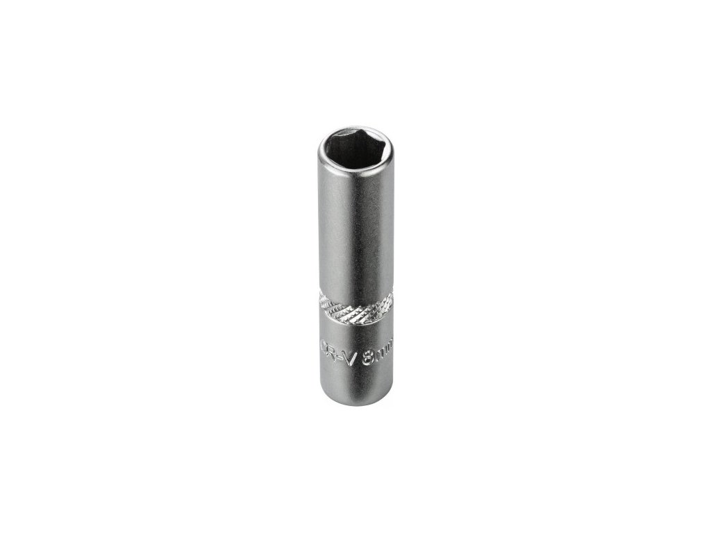 Šesťhranný nadstavec k nástrčkovým kľúčom, dlhé prevedenie, z chróm-vanádiovej ocele, pochrómovaný povrch, kosouhlo vrúbkovaný. Nástrčkový orech dlhý 1/4", 8 mm