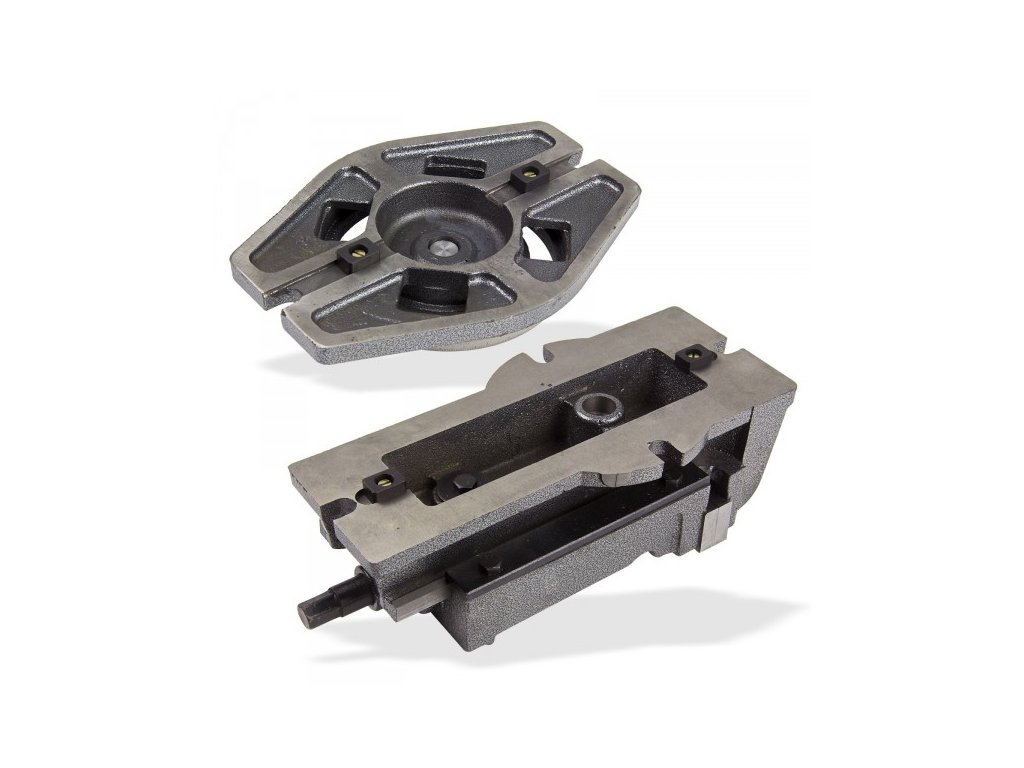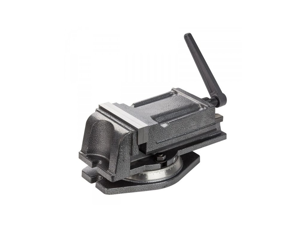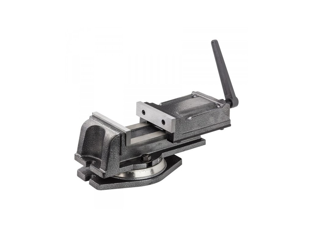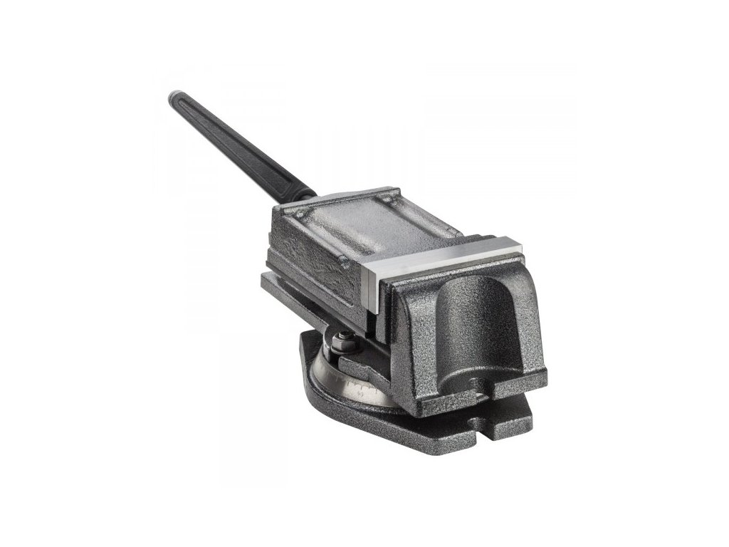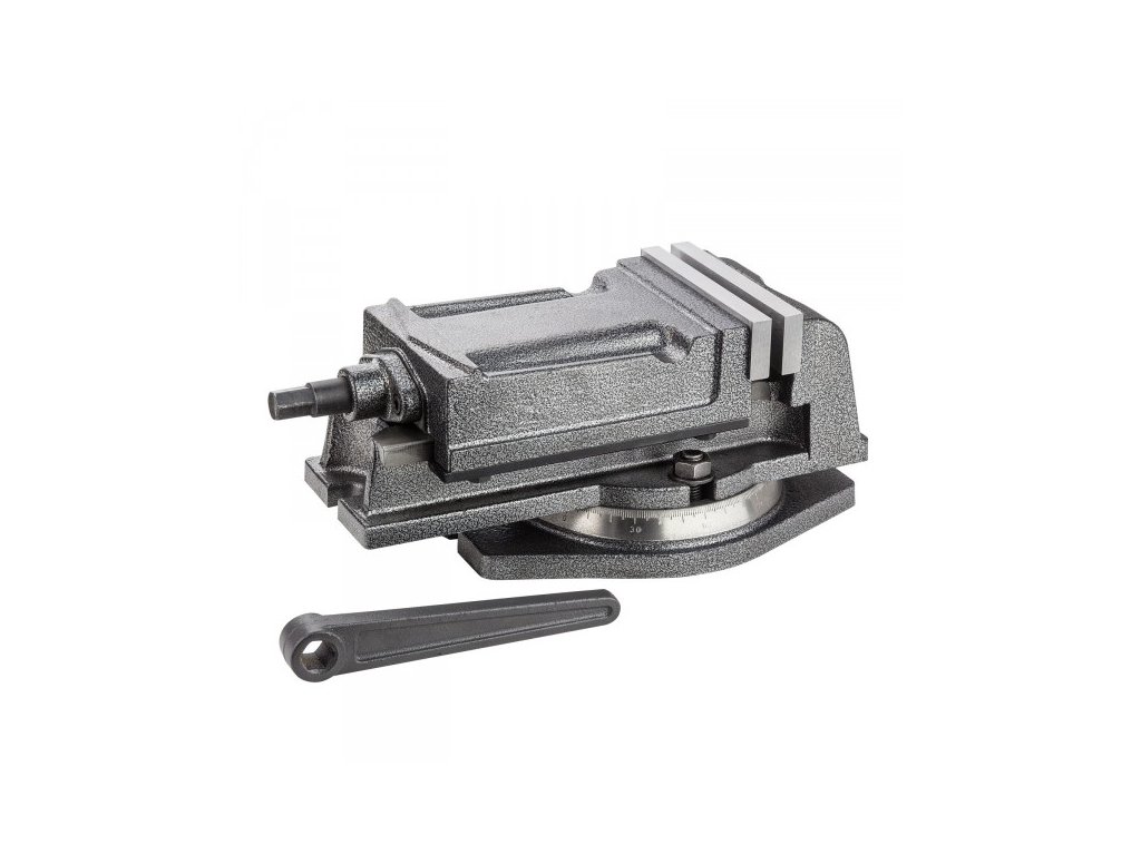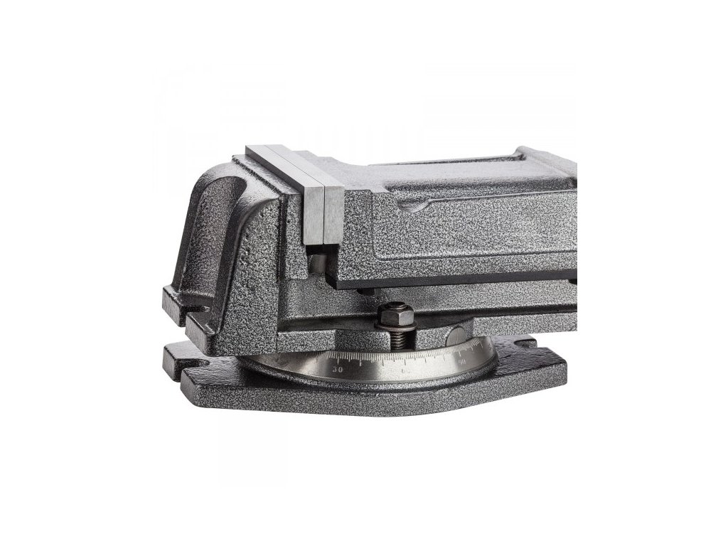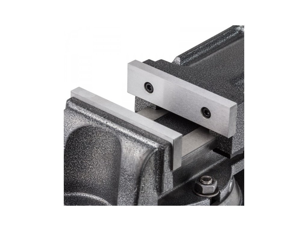 Zverák s paralelným vedením čeľustí, so skrytým vretenovým prevodom. Otočný tanier so stupnicou, aretovateľnou skrutkami. Otočný zverák 125 mm Profi