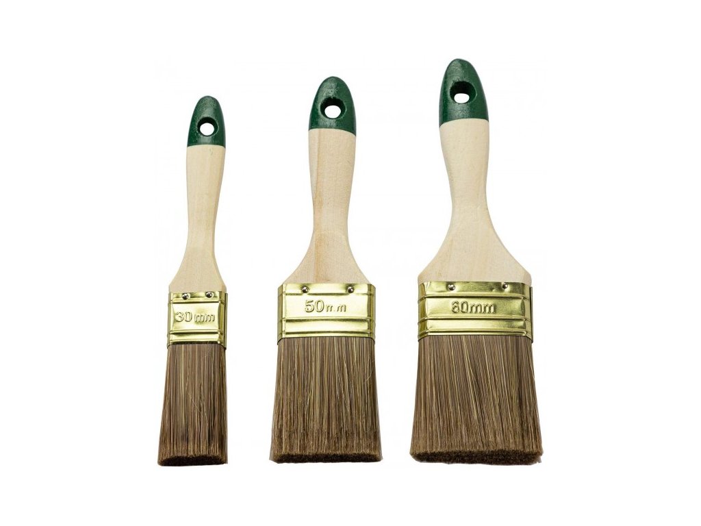 Trojdielna súprava plochých štetcov, vhodných na rozotieranie náterových farieb na steny, lazúrových lakov, disperzných farieb, moridiel, olejových náterov a lakov. Veľmi kvalitné uchytenie štetín, ergonomicky tvarovaná drevená násada, rovnomerné nanášanie a rozotieranie farby.