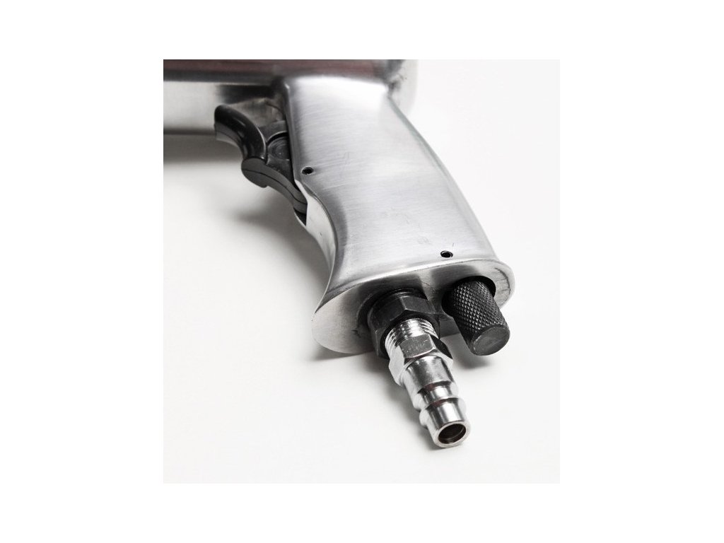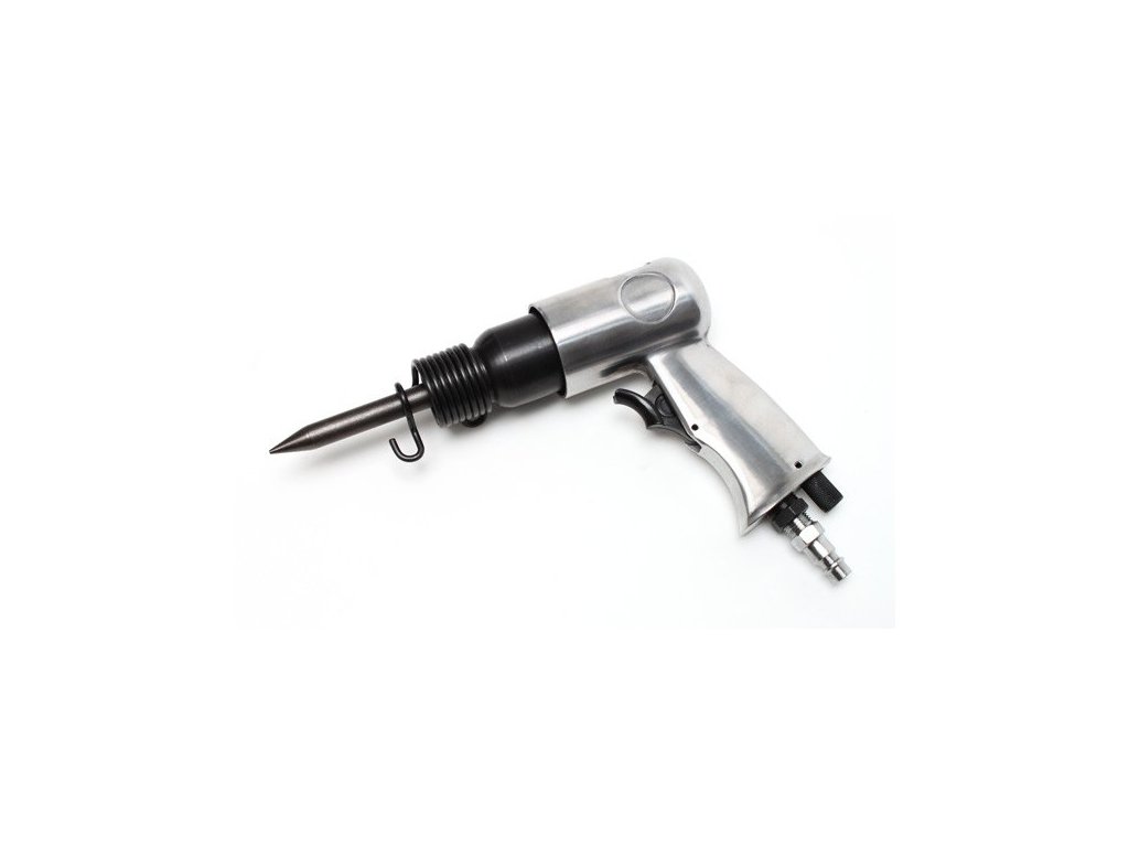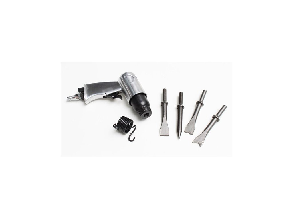Celokovové prevedenie hliník / chróm / pozinkovanie. Vrátane 4 sekáčov s okrúhlym upínaním: 1 x špicatý sekáč, 1 x plochý sekáč 20 mm, 1 x rozdeľovací sekáč 20 mm, 1 x nitovací sekáč 20 mm. Pneumatické búracie a sekacie kladivo DLM 5/6 M