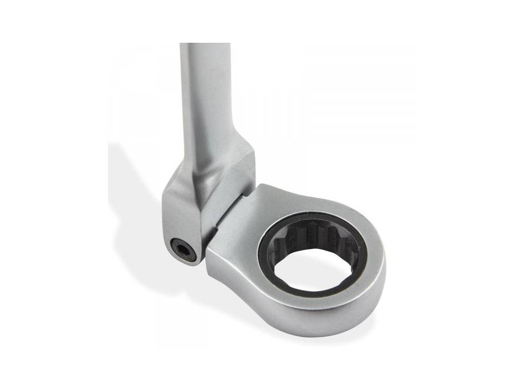 Kĺbový očkovo-vidlicový kľúč s račňou z kvalitnej chrómovo-vanádiovej ocele. Vhodný predovšetkým na použitie na ťažko prístupných miestach. Hlava obojstranne výkyvná o 100°