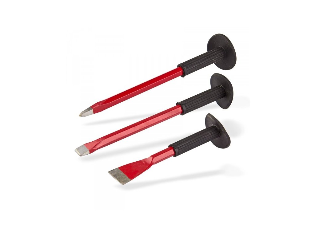 3-dielny set sekáčov s pogumovanými rukoväťami a chráničmi rúk. Využiteľný predovšetkým pri novostavbách alebo rekonštrukčných prácach. Pogumovaná rukoväť s odnímateľným chráničom rúk.