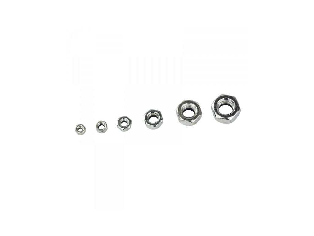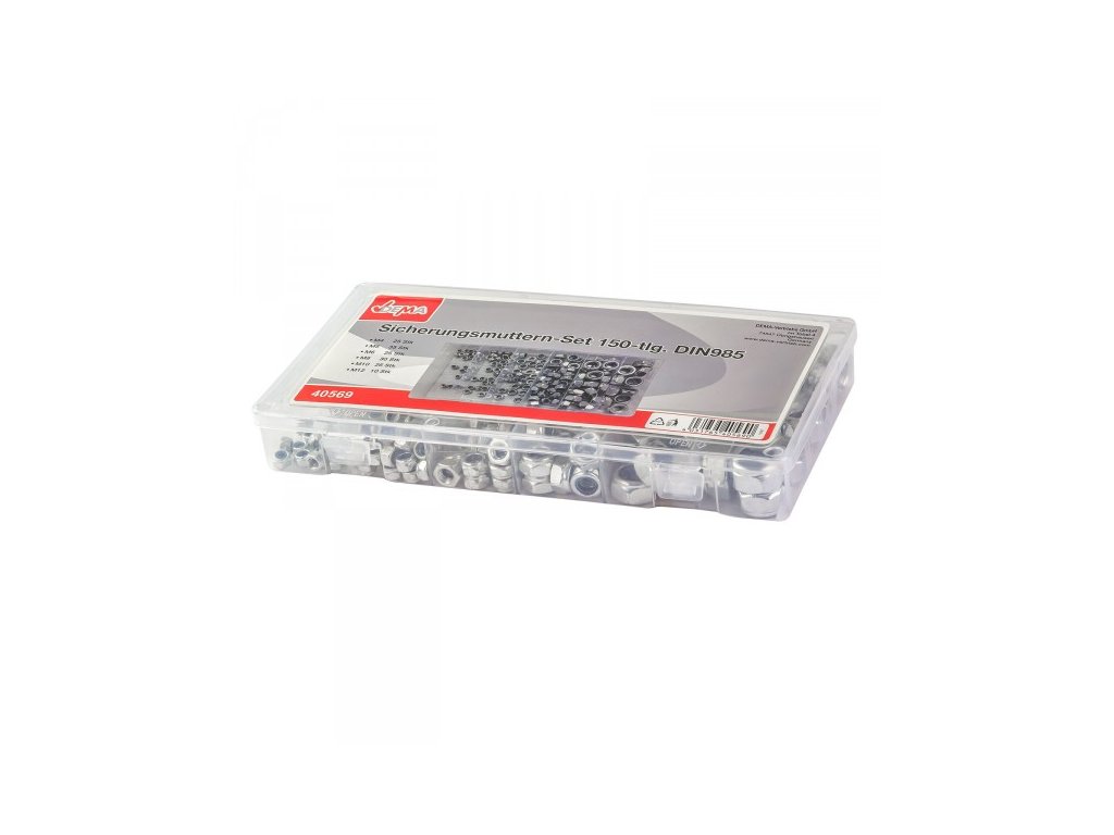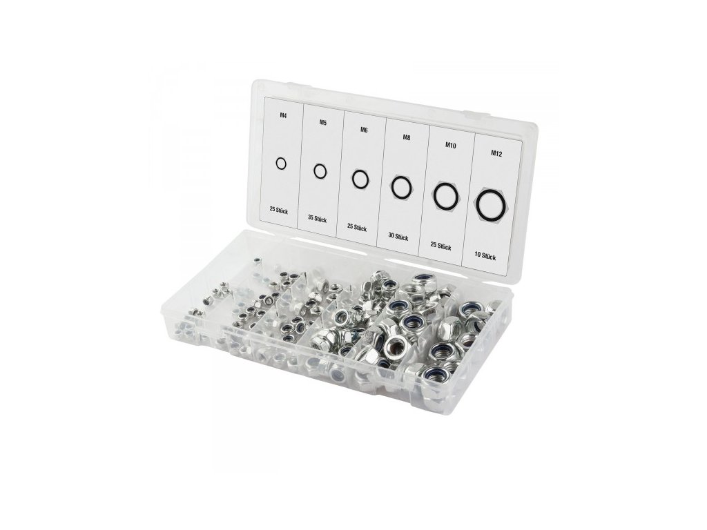 Sada obsahuje bežne používané veľkosti, galvanicky pozinkovaná oceľ, polyamidová vložka, uložené v prehľadnom boxe, veľkosti vyobrazené na vnútornej strane veka. Poistné matice DIN 985, 150 ks