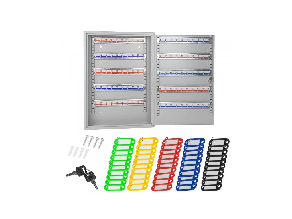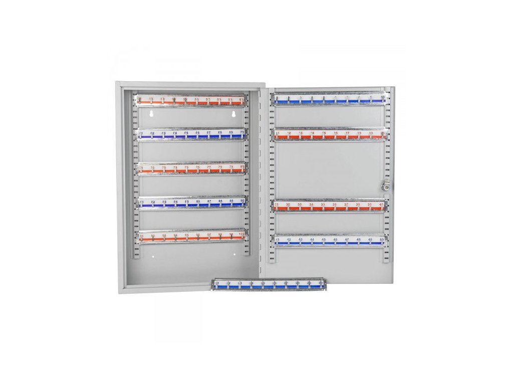 Skrinka je vhodná na uskladnenie kľúčov, s možnosťou nastavenie výšky hákových líšt. Farebné kľúčenky v 5 farbách pre kľúče (spolu 50 ks), slúžiace na lepšie rozpoznanie kľúčov. Cylindrický zámok skrinky s dvoma kľúčmi a možnosťou upevnenia na stenu (skrutky sú súčasťou balenia). Farba: svetlá šedá (RAL 7035)