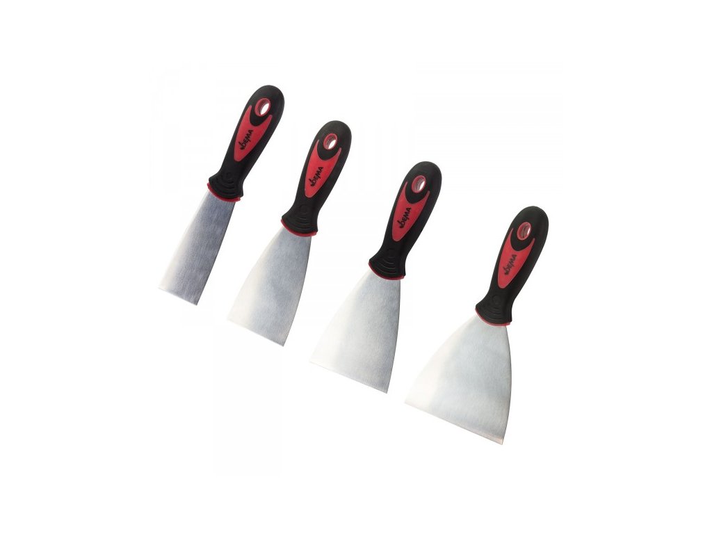 Štvordielna sada špachtlí s plastovými rukoväťami. Pre nanášanie sadry, malty, stierky, vypĺňanie špár, či vysprávky rôznych povrchov. Vďaka gumeno – plastovým rukovätiam a nezaobleným rohom sú aj práce ne plochách, zbiehajúcich sa do uhla rýchle, čisté a efektívne. Jemne leštená ušľachtilá oceľ, prevedenie: rovné.