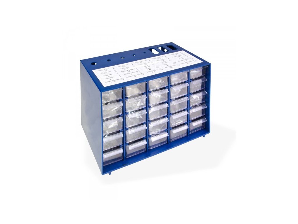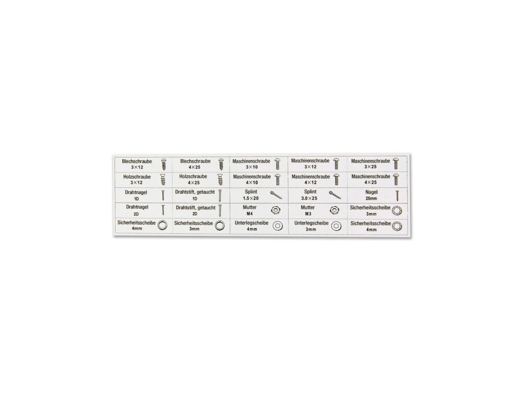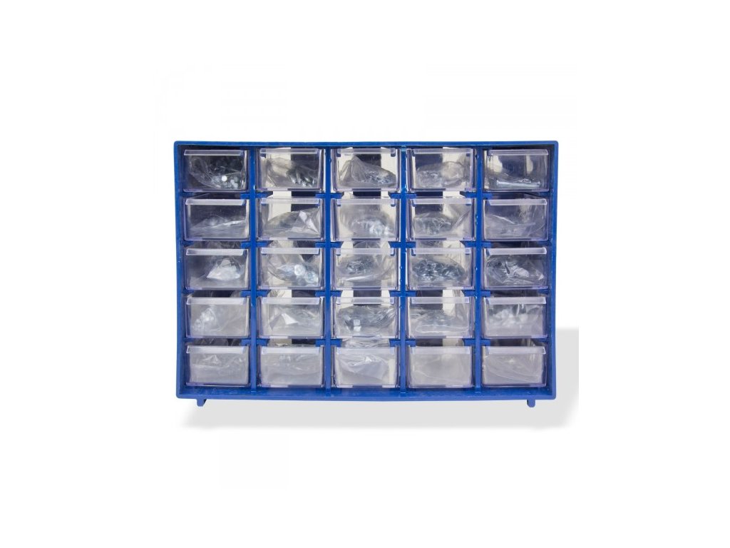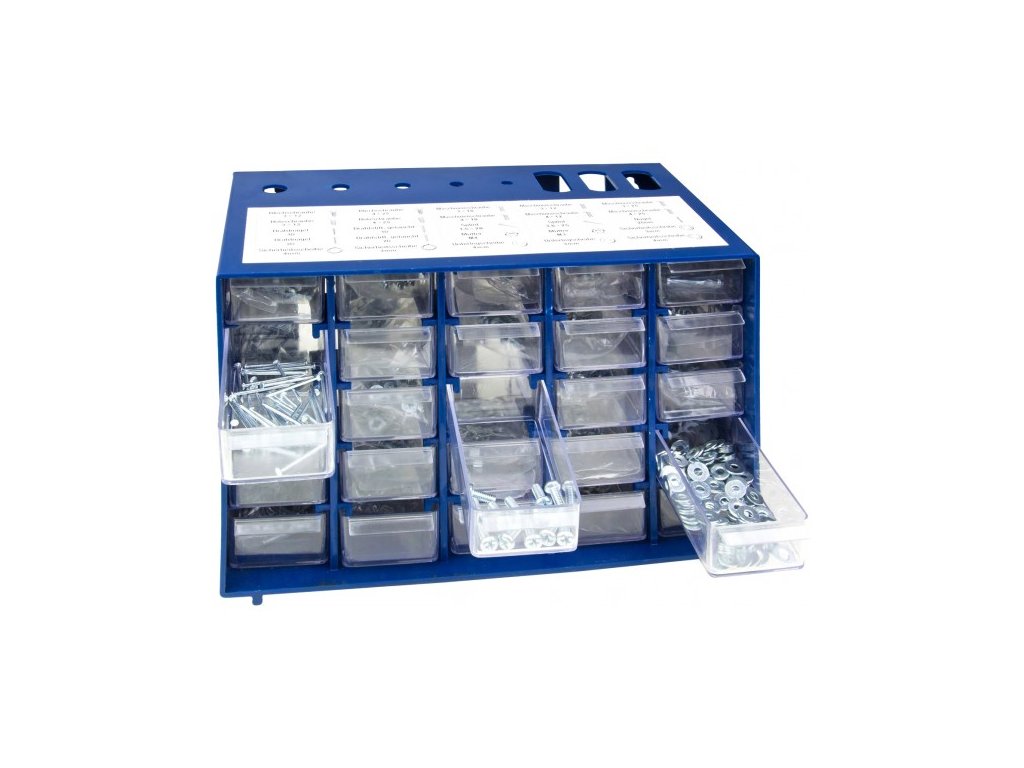 1000-dielna sada. S možnosťou upevnenia na stenu, 25 priehradiek s transparentnou prednou časťou, integrovaný držiak náradia na 3 ks klieští a 5 skrutkovačov (nie sú súčasťou dodávky) Materiál: pevný plast