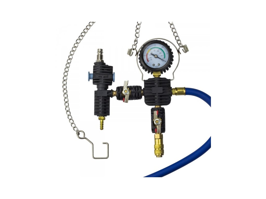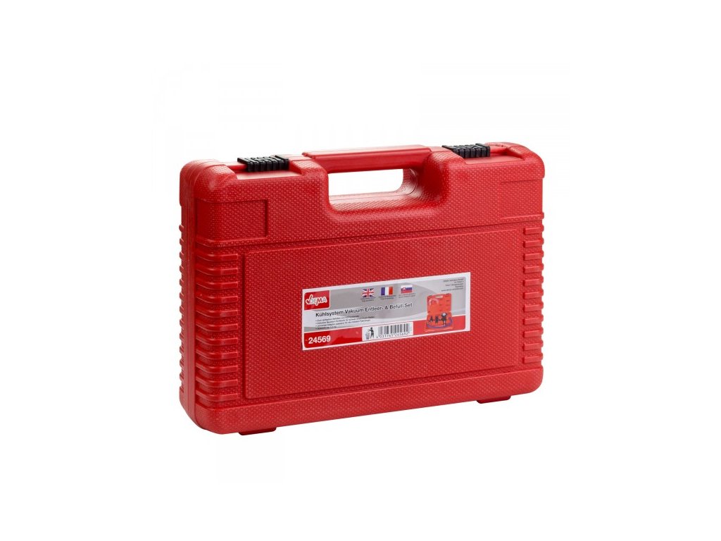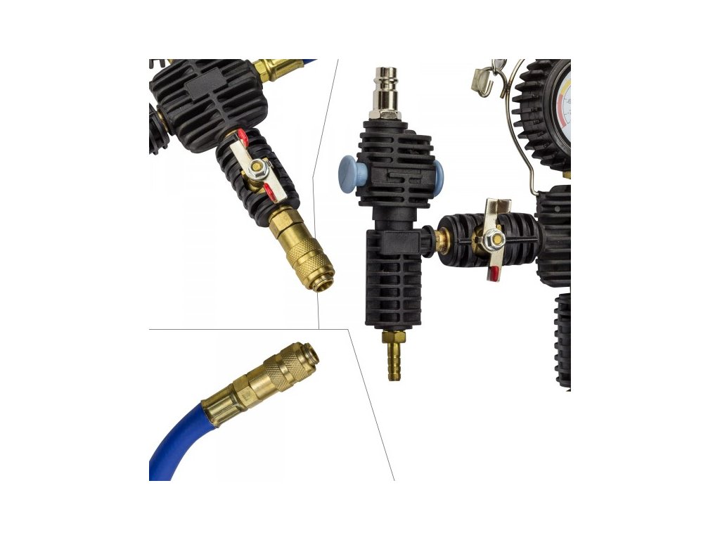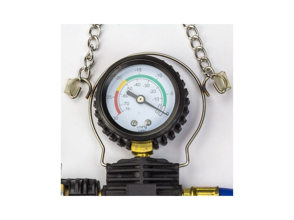 Sada pre vákuovanie a plnenie chladiacich systémov. Odborná, čistá, rýchla a bezpečná výmena chladiva vo vašom vozidle. Univerzálne pripojenie umožňuje spojiť s takmer všetkými bežnými značkami. Pomocou tohto systému je možné bez problémov aj plnenie. Vstavané ventily umožňujú udržiavať v systéme podtlak. Súprava obsahuje: univerzálny adaptér, hadice pre adaptér a rýchlospojky, retiazku na zavesenie, manometer odolný voči nárazom, kufrík.