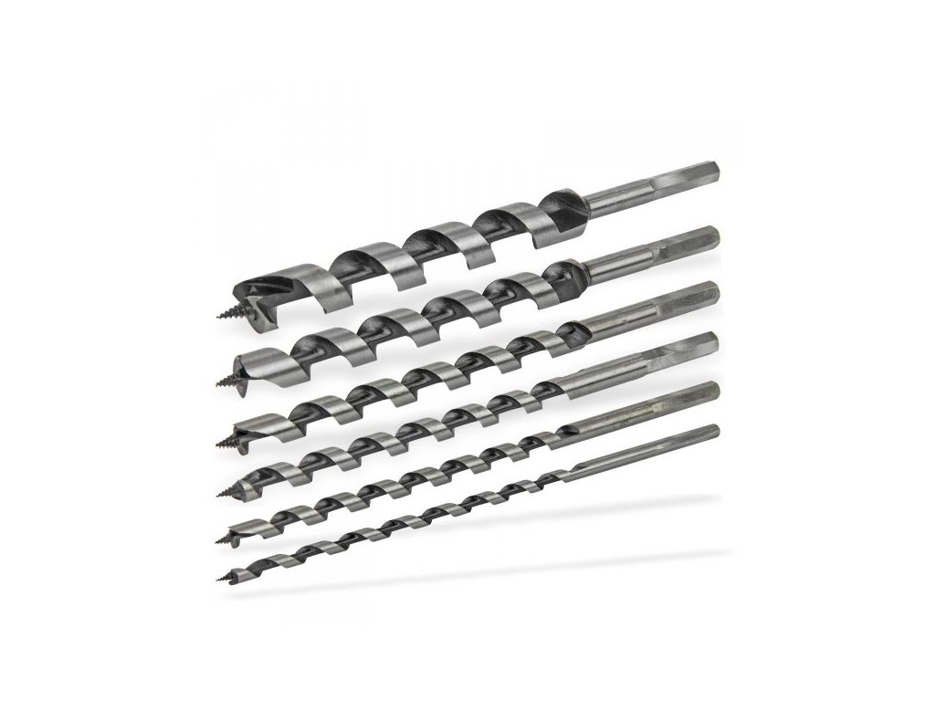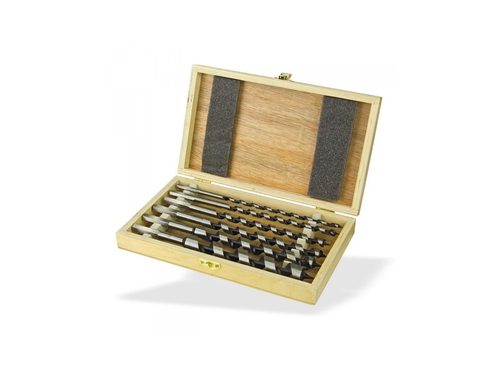 Vrtáky do dreva na presné, rýchle a čisté vŕtanie otvorov do dreva, v praktickom drevenom boxe. Všetky vrtáky s upínacím hrotom so závitom. Každý vrták má stredový bod so závitom, ktorý zaisťuje, že vrták je vtiahnutý do dreva a neskĺzava. Mierne predĺženie s rotáciou proti smeru hodinových ručičiek. Vyhotovené z nástrojovej ocele. Nízka hmotnosť, 6-hranné upínanie vhodné pre všetky bežné skľučovadlá.