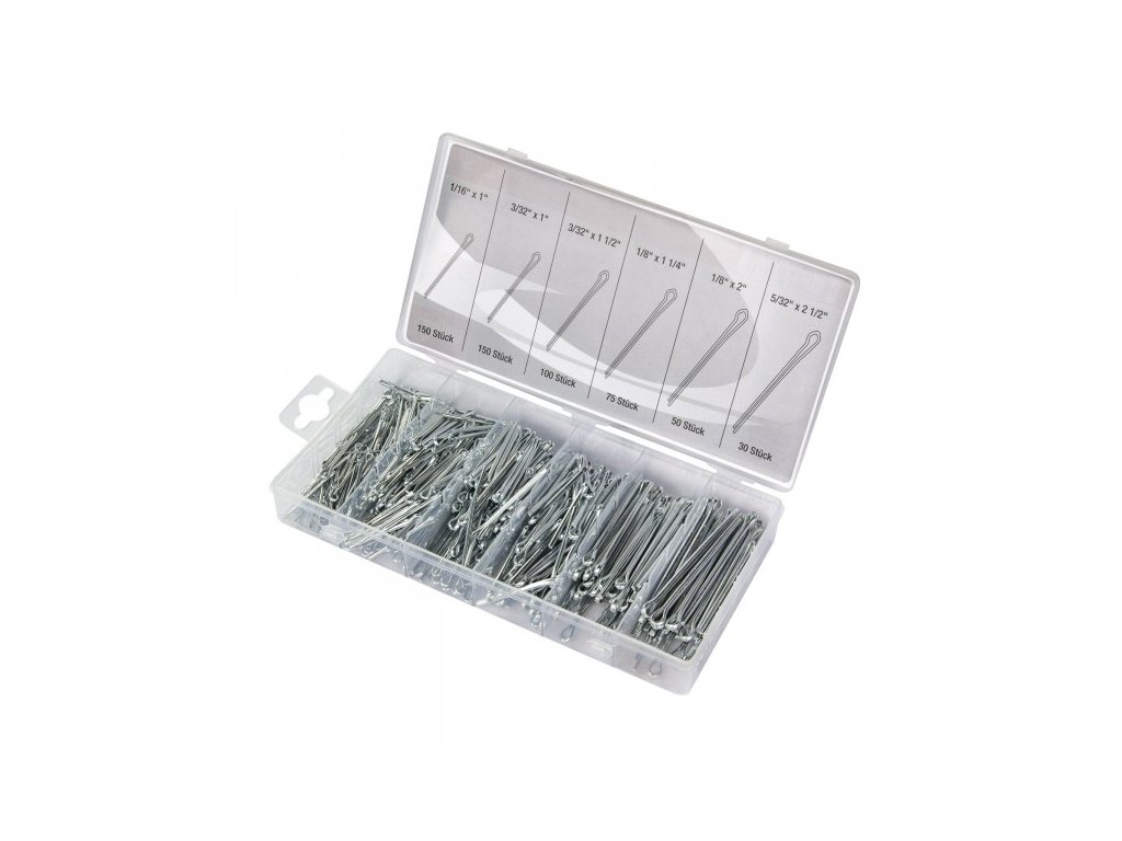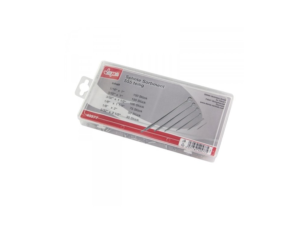Závlačky v prehľadnom transparentnom boxe, údaje o obsahu s rozmermi vnútri veka. Veľký rozsah sortimentu. Závlačky 555 ks