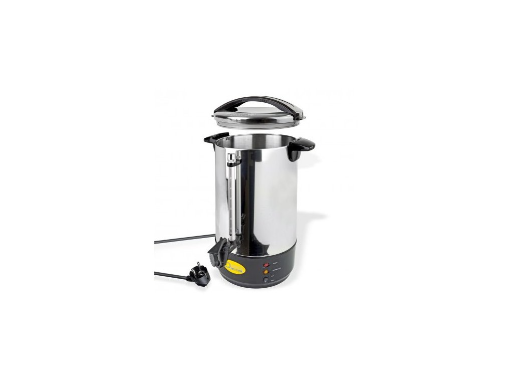 Hrniec z ušľachtilej ocele s objemom 10 l určený na prípravu teplej vody na čaj, kávu. Korpus z ušľachtilej ocele, gumové nožičky , priehľadné sklíčko umožňuje kontrolovať hladinu vody, funkcia na udržiavanie teploty s automatickým zapnutím, funkcia ohrevu a varenia s termostatickým ovládaním. Elektrický hrniec na punč, varené víno, vodu 10 L 950 W