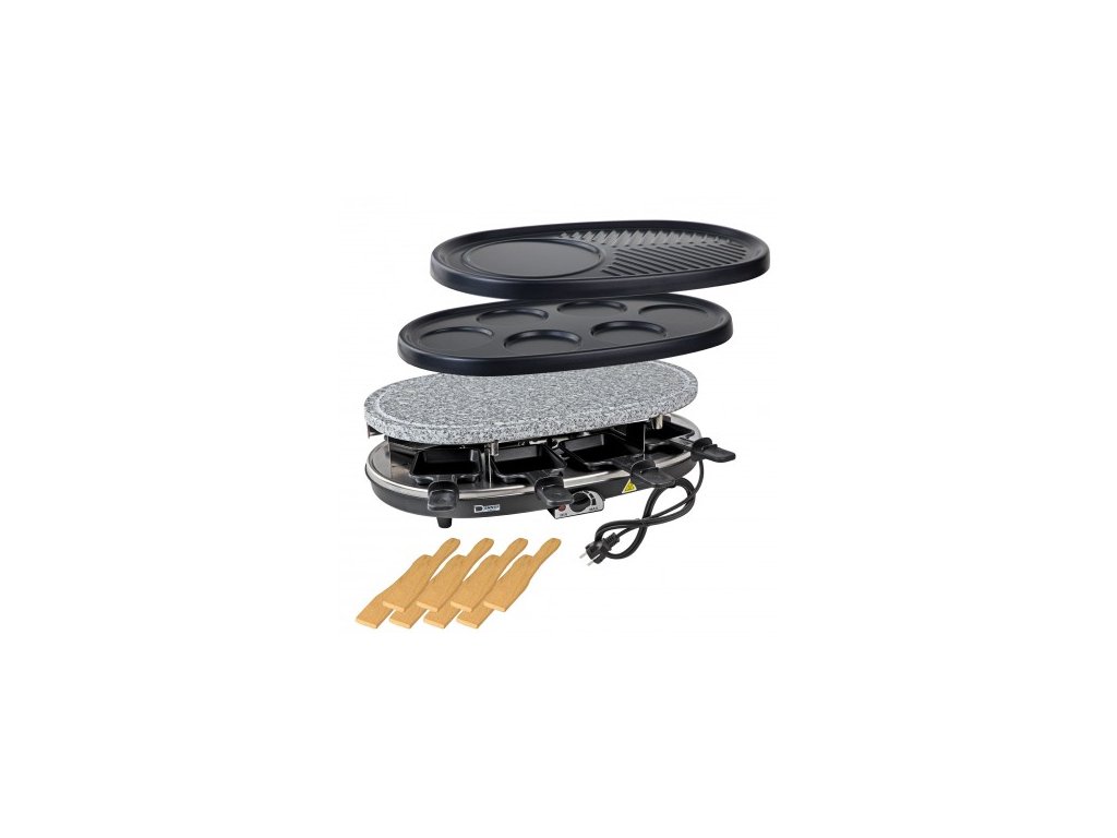 Gril na prípravu pokrmov z taveného syra raclette v sebe spája tri prístroje v jednom. Okrem prípravy jedál zo syra raclette gril ponúka aj dusenie ovocia a zeleniny, prípravu sladkých jedál ako palaciniek a omeliet s prísadami, grilovanie mäsa a rýb s nízkym obsahom tukov na rozpálenom kameni. Ľahko sa čistí. Vrátane osem panvičiek rovnakej veľkosti s nelepivým povrchom, s vhodnými drevenými stierkami. Dve úrovne na udržanie teploty varenia a dusenia, s nelepivým povrchom a rôznymi platňami, napríklad na palacinky, grilované pokrmy, dusenie a udržanie teploty. Mramorová kamenná platňa z jednej strany leštená, s vyfrézovanou drážkou na šťavu. Plynulé nastavenie termostatu otočným regulátorom, s indikátorom prevádzkového stavu, gumené protišmykové nožičky.