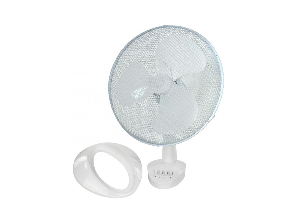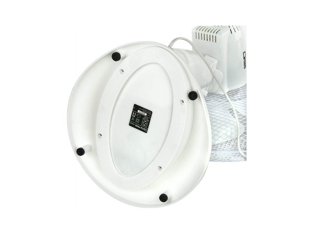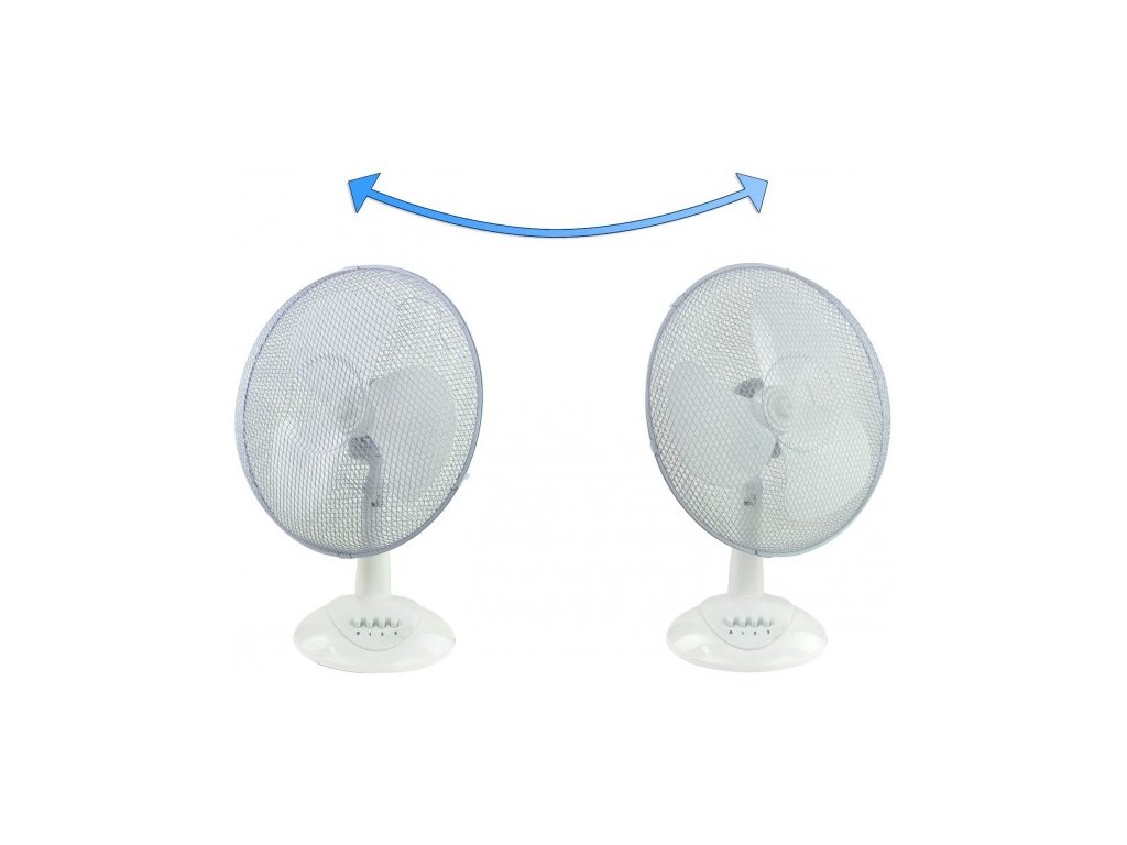 Stolový ventilátor so širokou základňou. Horizontálna oscilácia, nízka hlučnosť a pevný stojan. Sklon je individuálne nastaviteľný, tri rýchlostné stupne.