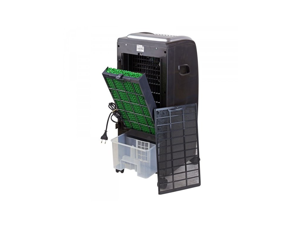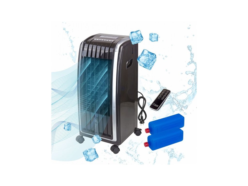 Ochladzovač vzduchu s tromi funkciami - 1. ventilátor má tri stupne a vytvára veľký závan čerstvého vzduchu, 2. chladenie: integrovaná nádržka na vodu sa môže naplniť vodou pre zvlhčenie vzduchu v zime alebo ľadovou vodou v lete pre aktívne ochladzovanie vzduchu, 3. čistiaca funkcia so vzduchovým filtrom, ktorý sa dá jednoducho očistiť a vybrať – aktívne filtruje prach, chumáče a chlpy. Okrem toho, tento prístroj má ionizáciu, ktorá viaže škodlivé vzduchové častice – a tak výrazne zlepšíte klímu v miestnosti. Súčasťou sú aj dva chladiace akumulátory, ktoré sa môžu vložiť do nádržky na vodu namiesto kociek ľadu. Jednoduchý princíp odparovania – funguje bez chémie, nenáročná inštalácia - stačí jednoducho postaviť na svoje miesto a zapnúť. Pojazdný vďaka otočným kolieskám s ľahkým chodom (dva otočné kolieská s brzdou), jednoduchá obsluha prostredníctvom manuálneho ovládacieho panelu a diaľkového ovládania. Funkcia časovača (automatické vypnutie), s možnosťou prepnutia na ionizáciu, trojstupňový ventilátor, tri režimy – normálne fúkanie, prirodzené fúkanie (automatická simulácia rôznych stupňov fúkania) a mierne fúkanie (nočná funkcia). S možnosťou prepnutia funkcie chladenia. Voda pritom kvapká na voštinový filter a vlhký vzduch sa vyfukuje ťahom vzduchu tlakového ventilátora na prednej strane. Tento efekt sa pre chladenie môže zosilniť tak, že sa voda aktívne chladí pomocou kociek ľadu alebo dodaných chladiacich akumulátorov. Funkcia SWING: Táto funkcia pohybuje vonkajšími, vertikálnymi lamelami sem a tam, a tak sa stará o pravidelné rozdelenie prúdu vzduchu napravo i naľavo. Vnútorné, horizontálne umiestnené lamely sa dajú ručne plynule prestaviť, a tak určujú výšku fúkania. Nízka spotreba elektrickej energie. S možnosťou celoročnej prevádzky (v lete ochladzovač vzduchu, v zime zvlhčovač vzduchu). Bočné držiaky. Všetky funkcie sa znázorňujú pomocou LED na zobrazovacej ploche. Vrátane uholníka pre montáž na stenu (poistka na zabránenie samovoľnému pohybu).
