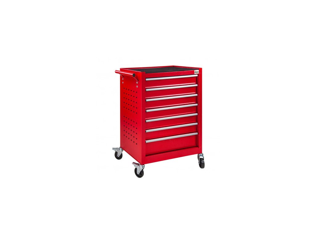 Dielenský vozík na náradie s celooceľovou konštrukciou, ošetrený práškovou farbou, so siedmimi vysúvacími zásuvkami so 7/8 výsuvom, vedené pomocou veľmi kvalitných guľôčkových ložísk, v každej zásuvke je výplň z penovej gumy. Držadlo na presúvanie, veľký odkladací priestor s gumenou vložkou a centrálne uzamykanie. Pohyblivý vďaka štyrom otočným kolieskam, z ktorých dva sú vybavené brzdou. Zásuvky je možné centrálne zablokovať proti neúmyselnému vysunutiu vďaka blokovaciemu systému (obslužná páka je umiestnená v spodnej časti). Zaistený poistkou proti vysunutiu (naraz je možné otvoriť iba jednu zásuvku. Ostatné zásuvky sú zatiaľ zablokované).