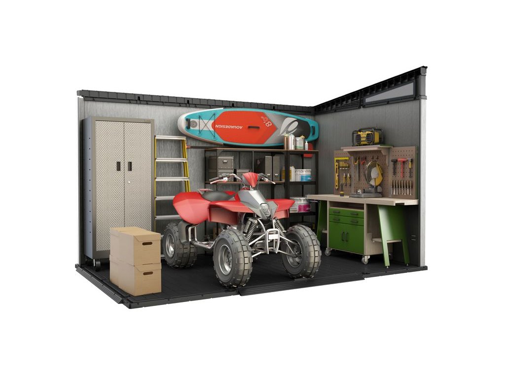 - domček je ideálny nielen na uschovávanie náradie a záhradných doplnkov, ale aj na kosačku alebo grill.