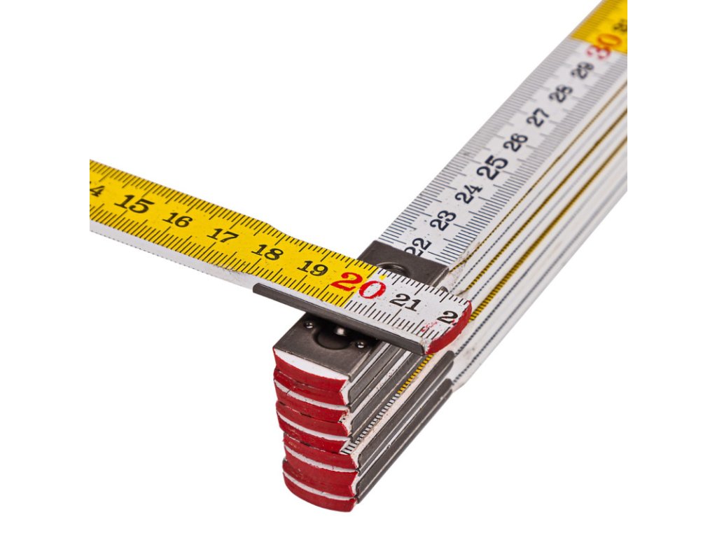 Skladací meter s dĺžkou 2 metre z pevného brezového dreva je lakovaný na bielo a žlto, má spoje z nehrdzavejúcej ocele. Vďaka tomu je skladací meter robustný a odolný a dokáže odolať aj tým najťažším pracovným podmienkam. Povrchová úprava namáčaním odolná voči poveternostným vplyvom a oderu. Skladací meter s dĺžkou 2 metre z pevného brezového dreva je lakovaný na bielo a žlto, má spoje z nehrdzavejúcej ocele. Vďaka tomu je skladací meter robustný a odolný a dokáže odolať aj tým najťažším pracovným podmienkam. Povrchová úprava namáčaním odolná voči poveternostným vplyvom a oderu. Potlač na oboch stranách. Pružinové pánty z nehrdzavejúcej ocele. Farba: biela / žltá Materiál: brezové drevo Trieda presnosti: III Šírka článku: 16 mm / 10 článkov Dĺžka: 2000 mm Rozmery zloženého metra (DxŠxV): 240 x 36 x 16,5 mm Hmotnosť: 125 gDoplňkové parametry