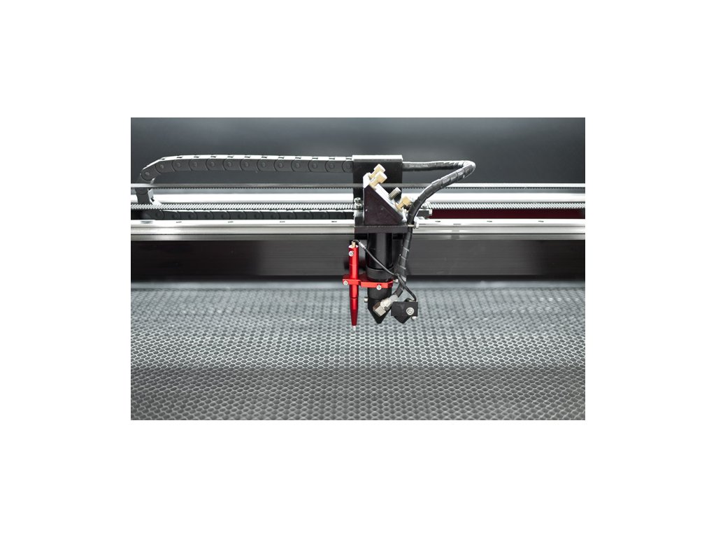 - Laserová hlava je vybavena 2,5" čočkou, přívodem stlačeného vzduchu (kompresor je součástí dodávky) a dotykovou sondou (sloužící k automatickému nastavení fokusu)