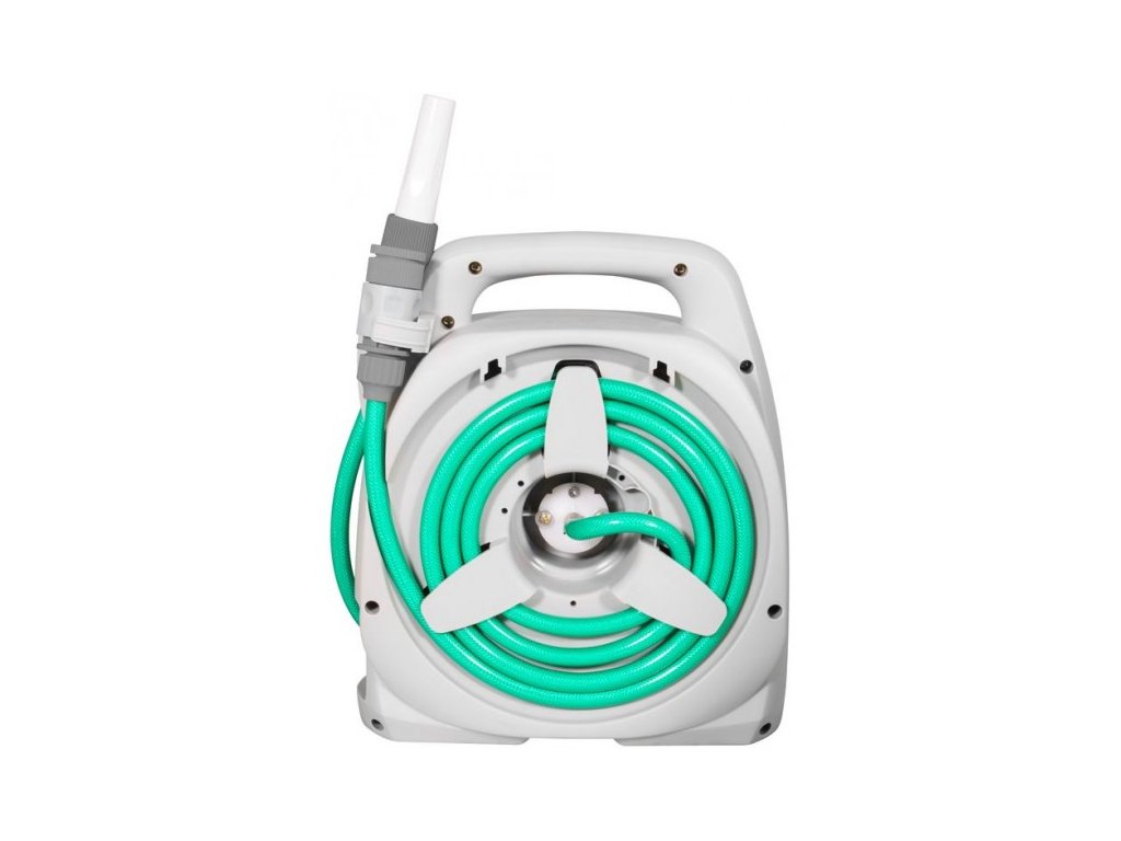 Bubon s 10 m hadicou s výpletom, rukoväť, 2 rýchlospojky, pripojovací kus pre rýchlospojku pre 3/4"IG / 1/2"IG, tryska, kľuka pre jednoduché navinutie hadice. Pracovná hadica: 10 m
