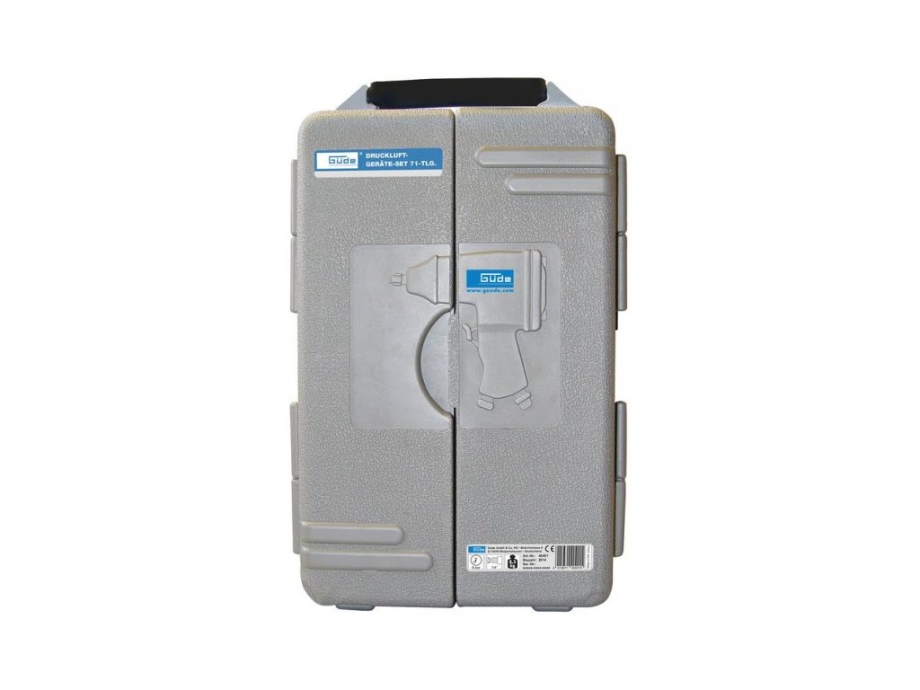 71-dielna sada pneumatického náradia/príslušenstva v dvojdielnom transportnom kufríku, obsahujúca základné vybavenie dielne, použitie na tlakový vzduch: rázový uťahovák ½“, račňový uťahovák ½“, búracie kladivo, priamu brúsku, pneu pištoľ MINI. Kufrík prispôsobený pre montáž na stenu dielne. Príslušenstvo: nástrčkové orechy, adaptér 3/8“-1/2“, bitový adaptér 3/8“, 9 bitov, 3 sekáče, prídržná pružina k pneu kladivu, brúsne nástavce, sada pneu adaptérov a trysiek, teflonová páska, olejnička. Vsuvky sú súčasťou dodávky (5).