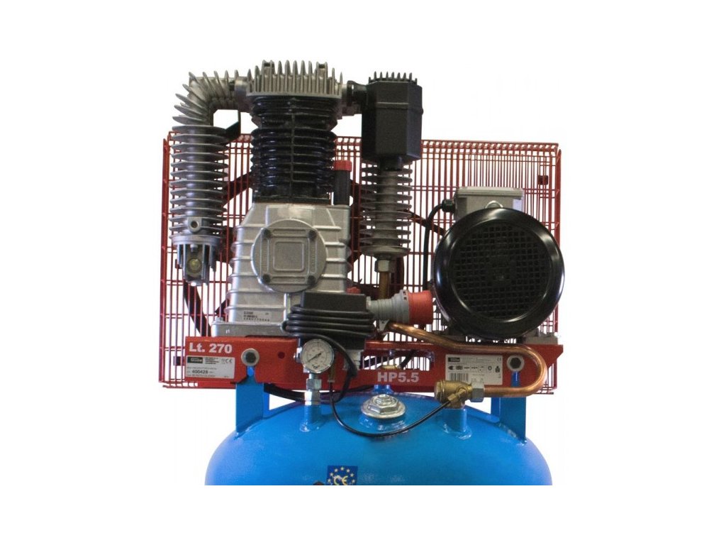 Stacionárny dvojstupňový dvojvalcový kompresor, veľký kryt klinového remeňa, 1 manometer, 2 m prípojný kábel, tlakový spínač, bezpečnostný ventil, výpustný ventil kondenzačnej vody, odvzdušňovací ventil, veľký chladič, vzduchový filter. Sieťové napätie: 400 V