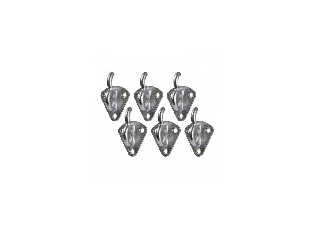 Zabezpečovací háčik s okom a tromi otvormi na montáž, vhodný na zaistenie nákladu a sietí na prívesoch, na zaistenie plachty u nákladných vozidiel s plošinou a podobne. Pozinkované prevedenie, na uchytenie šnúry alebo upínacieho popruhu. V balení 6 ks.