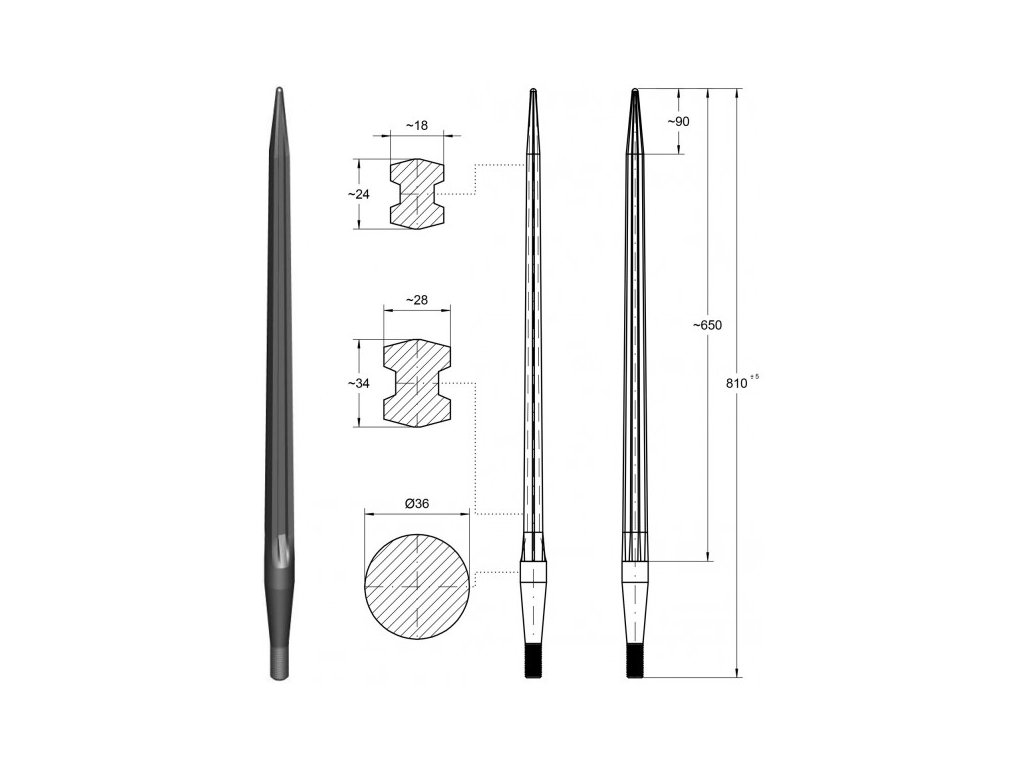Predný nakladací hrot pre vidly na hnoj, valcovaná pružinová oceľ, vytvrdená a temperovaná, lakovaná. Hrot predný nakladací 22x1,5/810 mm, červený