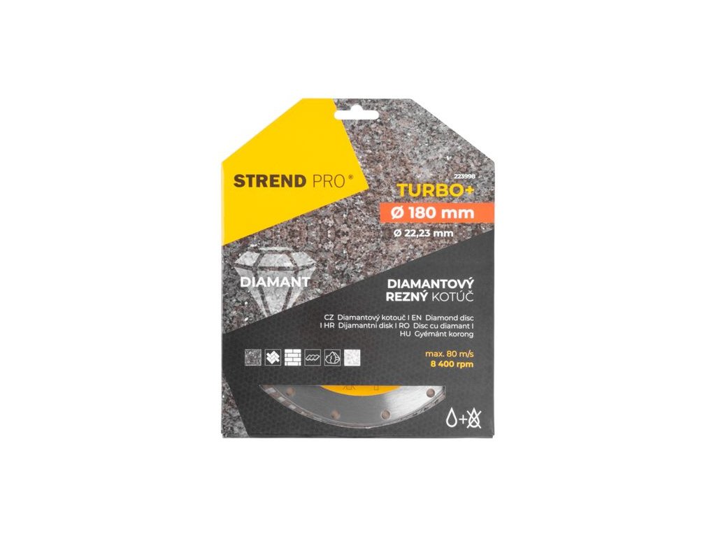 Diamantový kotúč Strend Pro je určený pre domácich kutilov, ale aj pre profesionálnych remeselníkov. Je vhodný na mokré aj suché rezanie. Konštrukcia TURBO+ lemu zachytáva vzduch v pohybe, čím sa zabezpečuje lepšie odvádzanie materiálu čo zaručuje čistejšie rezné hrany bez odlamovania materiálu, rýchlejšie rezy, optimálnu životnosť a zároveň dochádza k redukcii zahrievania. Chladiace otvory pomáhajú zvýšiť viditeľnosť pri rezaní odvádzaním materiálu a zaisťujú rozptyl tepla. Má široké využitie - žula, dlažba, obklad a je možné jeho použitie na mramor, tehly, kameň, murivo a strešnú krytinu. Jeho priemer je 180 mm a maximálne povolené otáčky sú 8 400 rpm.Doplňkové parametry