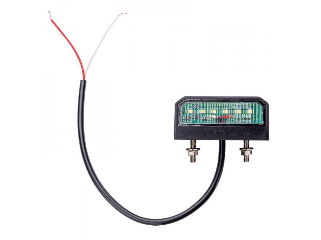 LED osvetlenie štátnej poznávacej značky vhodné na prívesy, traktory, nákladné vozidlá, štvorkolky, terénne vozidlá, motocykle, ako aj osobné vozidlá s palubným napätím 12 až 24 V. S upevňovacou súpravou, ktorá je súčasťou balenia. S E-kontrolným číslom, vyrobené zo špeciálneho odolného plastu. Dodáva sa kompletne s nerezovými upevňovacími skrutkami so závitom, vrátane matíc. Pevne zaliaty pripojovací kábel, SMD LED.