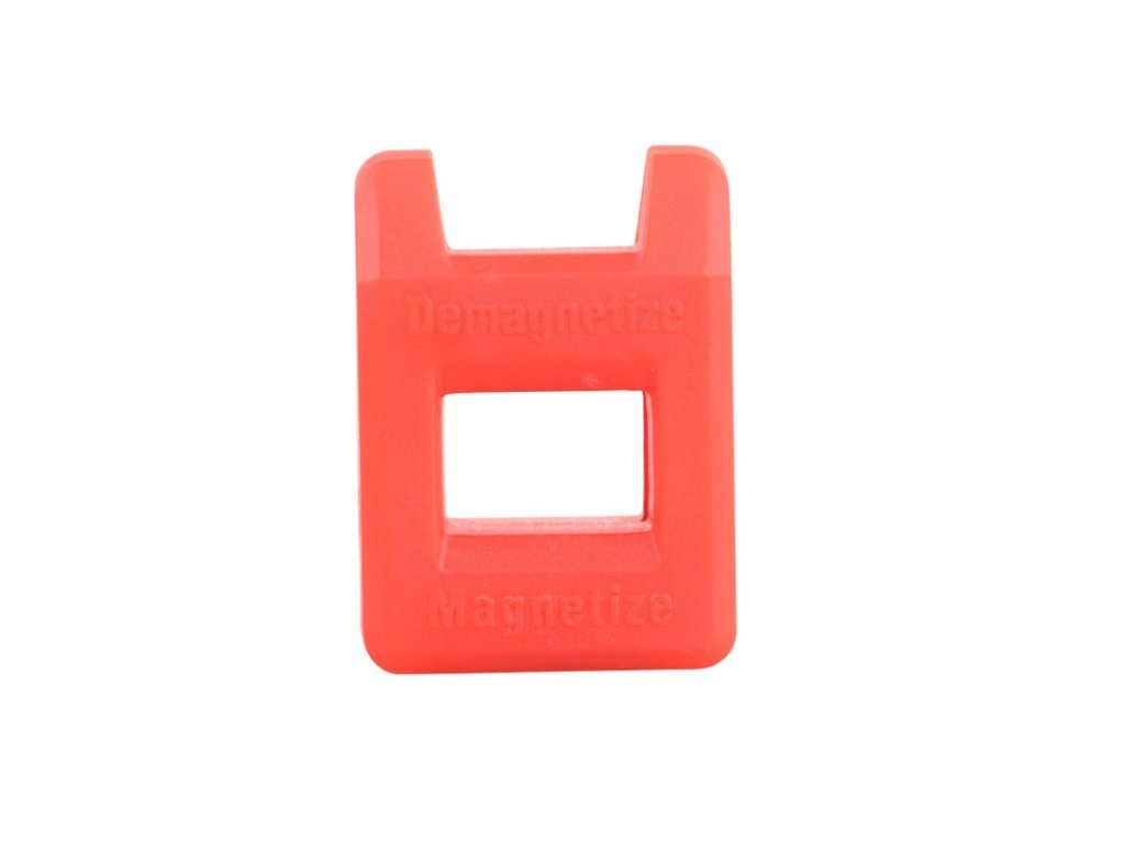 Pomôcka na magnetizáciu alebo demagnetizáciu hlavíc skrutkovačov alebo iných oceľových nástrojov. Vyrobené z magnetu uzavretého v plastovom puzdre. Pomôcka na magnetizáciu alebo demagnetizáciu hlavíc skrutkovačov alebo iných oceľových nástrojov. Vyrobené z magnetu uzavretého v plastovom puzdre. Používanie je veľmi jednoduché: pomaly presuňte nástroj cez otvor a hrot nástroja sa zmagnetizoval. Na demagnetizáciu jednoducho položte nástroj na vrch. Materiál: ABS plast, magnet Farba: červená Celkové rozmery (DxŠxV): 29 x 20 x 40 mm Hmotnosť: 22 gDoplňkové parametry