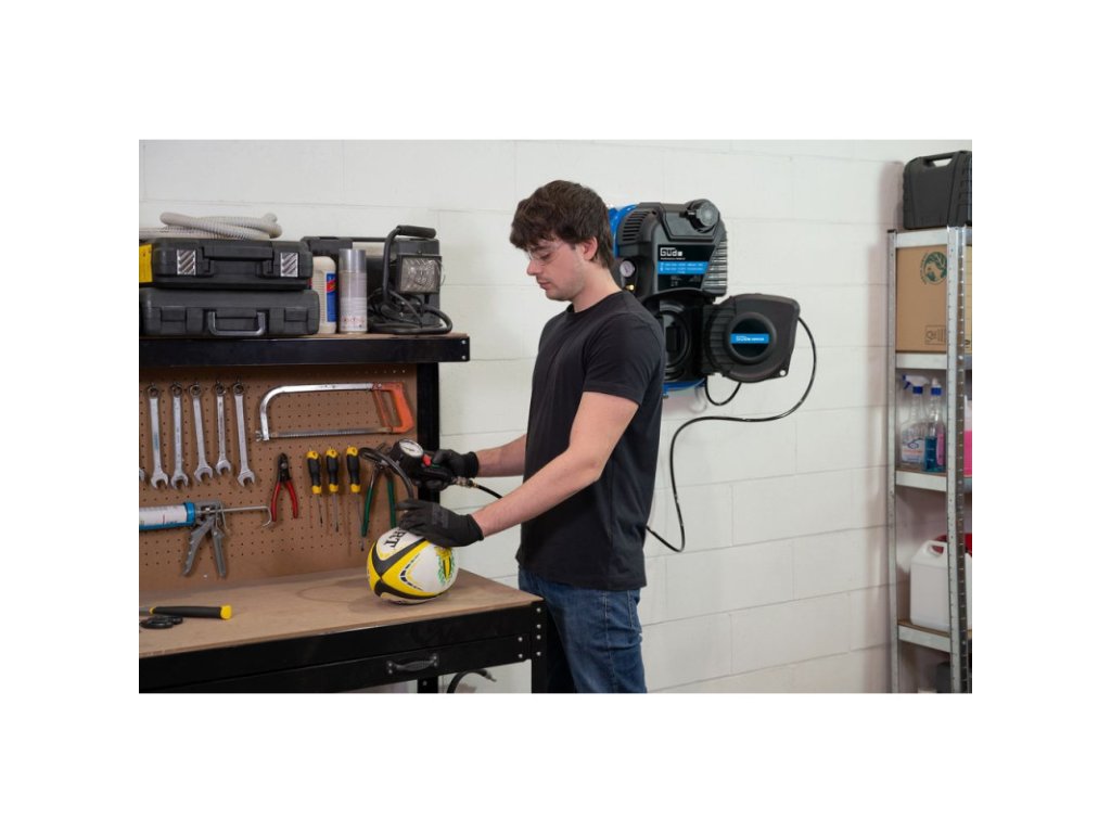 Nástenný kompresor GWK 160/8/2 ST nesmie chýbať na stene v žiadnej garáži alebo dielni. Ako naznačuje názov modelu, túto stanicu stlačeného vzduchu je možné namontovať na akúkoľvek stenu, aby sa ušetrilo miesto a nezaberala cennú plochu na podlahe. Kompresor s nízkou hlučnosťou dodáva tlak 8 bar a hadicový navijak otočný o 180° zabezpečuje pracovný rádius 9 metrov. Samozrejme, tento kompaktný kompresor je bezolejový, a teda bezúdržbový. Hadica na stlačený vzduch vystužená tkaninou je odolná voči oleju aj teplotám do -20 °C a je bez problémov prejazdná autom, keď je pod tlakom. Stanica stlačeného vzduchu pre montáž na stenu, vrátane kompresora a integrovaného automatického navíjača hadice. Vhodný pre autá, motocykle, pneumatiky bicyklov, nafukovacie matrace, lopty a mnohé iné.Napájacie napätie: 230 VFrekvencia: 50 HzVýkon motora (P1): 1100 WPrevádzkový režim: S3/25%Trieda ochrany: IDruh krytia: IP20Agregát: bezolejovýOtáčky motora: 1450 ot./min.Otáčky kompresora: 2000 ot./min.Sací výkon: 160 l/min.Efektívne dodávané množstvo 0 bar: 90 l/min.Efektívne dodávané množstvo 4 bar: 60 l/min.Maximálny tlak: 8 barObjem nádoby: 2 lPočet valcov: 1Počet spojok na stlačený vzduch: 1Manometer: 1Dĺžka hadice: 9 m s pripojovacou spojkouDruh kábla: H05VV-FDeklarovaná hodnota hluku LwA: 89 dBHladina akustického tlaku LpA: 69 dBRozmery (ŠxHxV): 390 x 200 x 560 mmHmotnosť netto/brutto: 11,2 kg/13,3 kgDoplňkové parametry