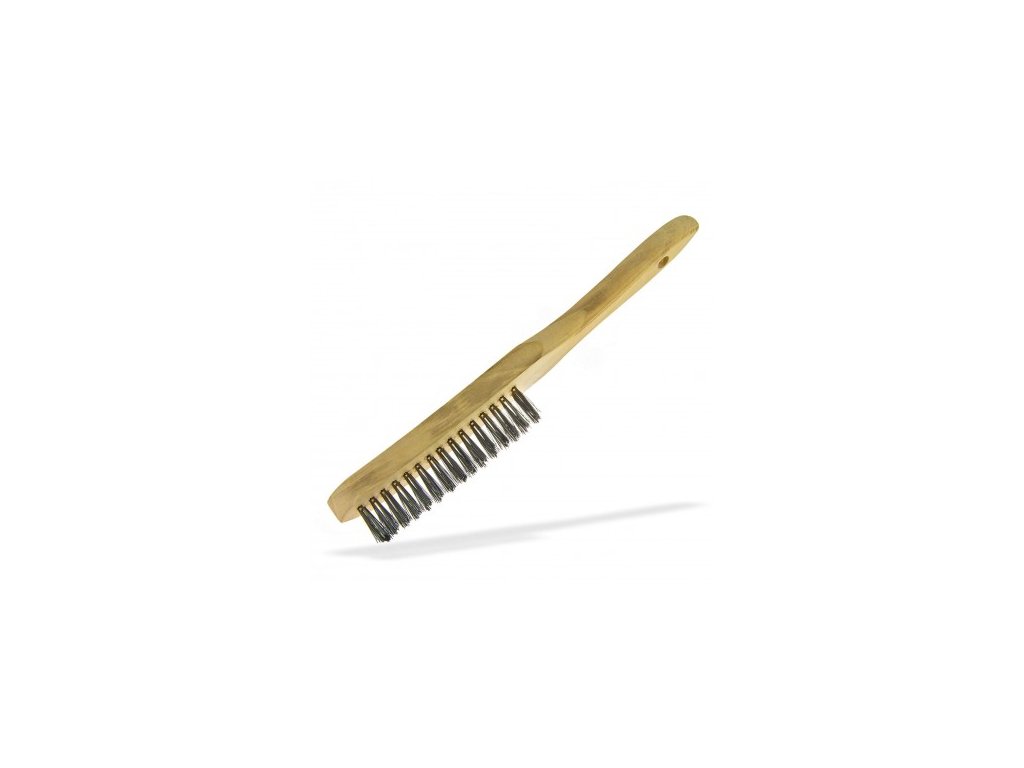Oceľová drôtená kefa s drevenou rukoväťou, ideálna napríklad na čistenie brzdových systémov, hrdzavých predmetov, na zdrsnenie povrchov a pod. Vybavenie: