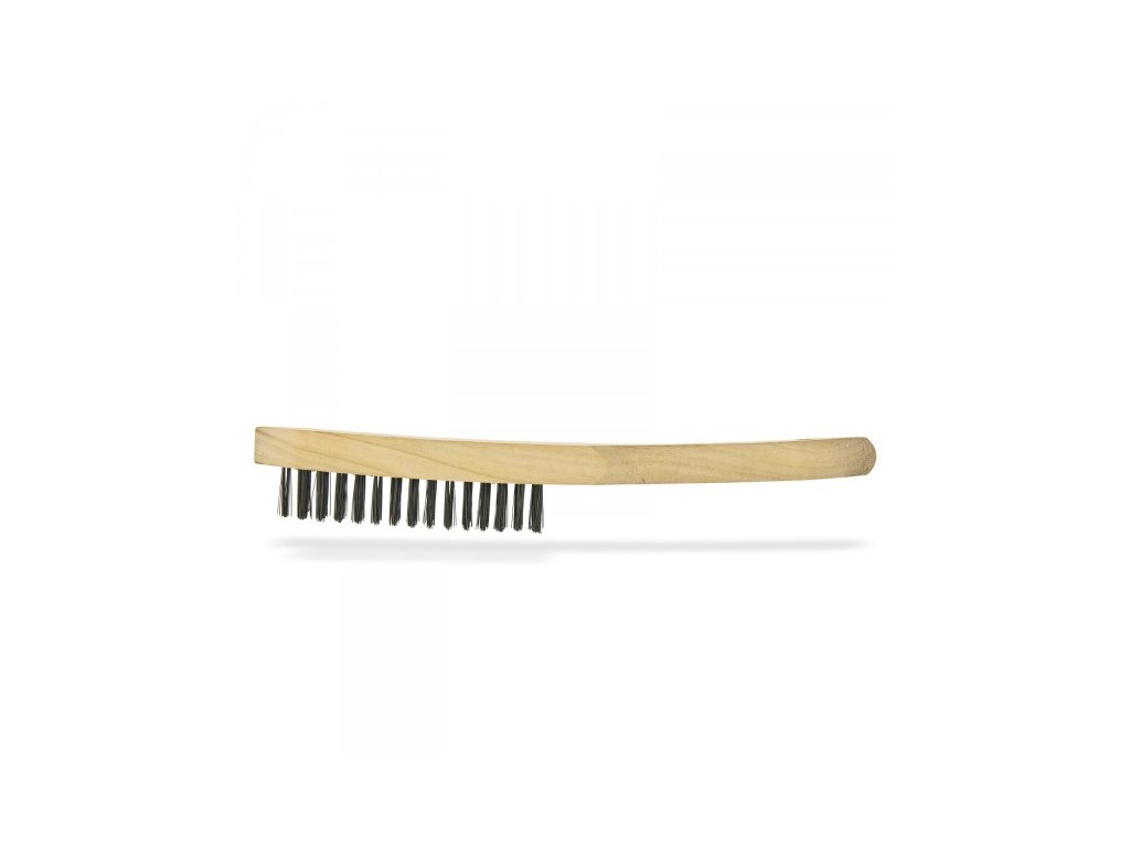 Oceľová drôtená kefa s oblúkovou drevenou rukoväťou, ideálna napríklad na čistenie brzdových systémov, hrdzavých predmetov, na zdrsnenie povrchov a podobne. Závesné očko na rukoväti. Oceľová drôtená kefa 3-radová DSDB3H