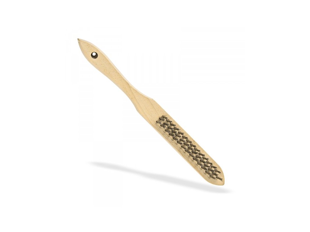 Oceľová drôtená kefa s oblúkovou drevenou rukoväťou, ideálna napríklad na čistenie brzdových systémov, hrdzavých predmetov, na zdrsnenie povrchov a podobne. Závesné očko na rukoväti.