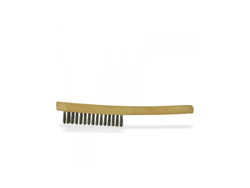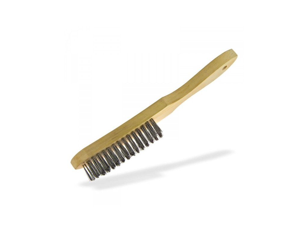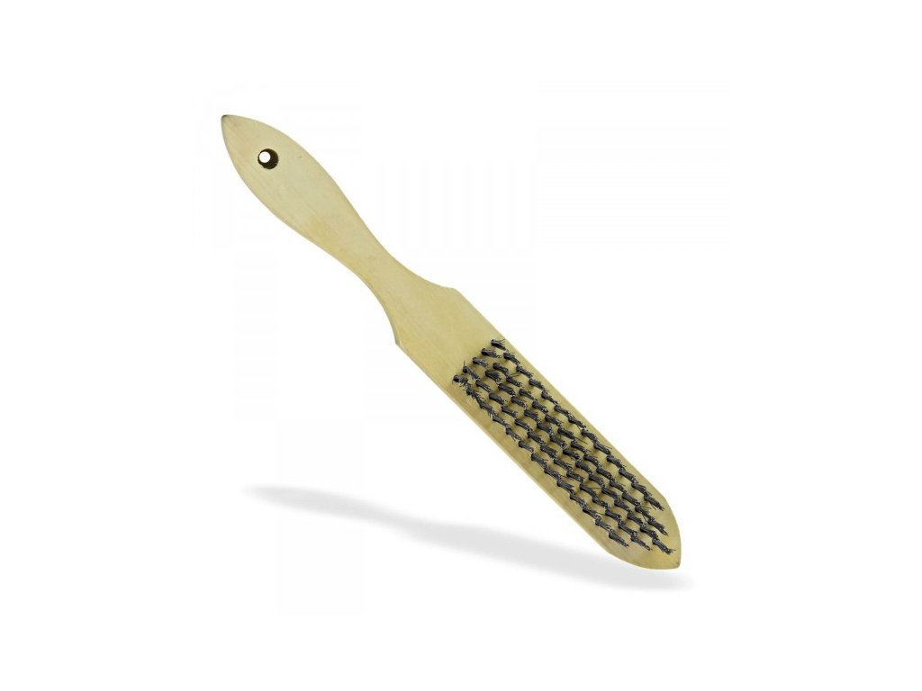 Oceľová drôtená kefa s drevenou rukoväťou, ideálna napríklad na čistenie brzdových systémov, hrdzavých predmetov, na zdrsnenie povrchov a pod. Vybavenie: