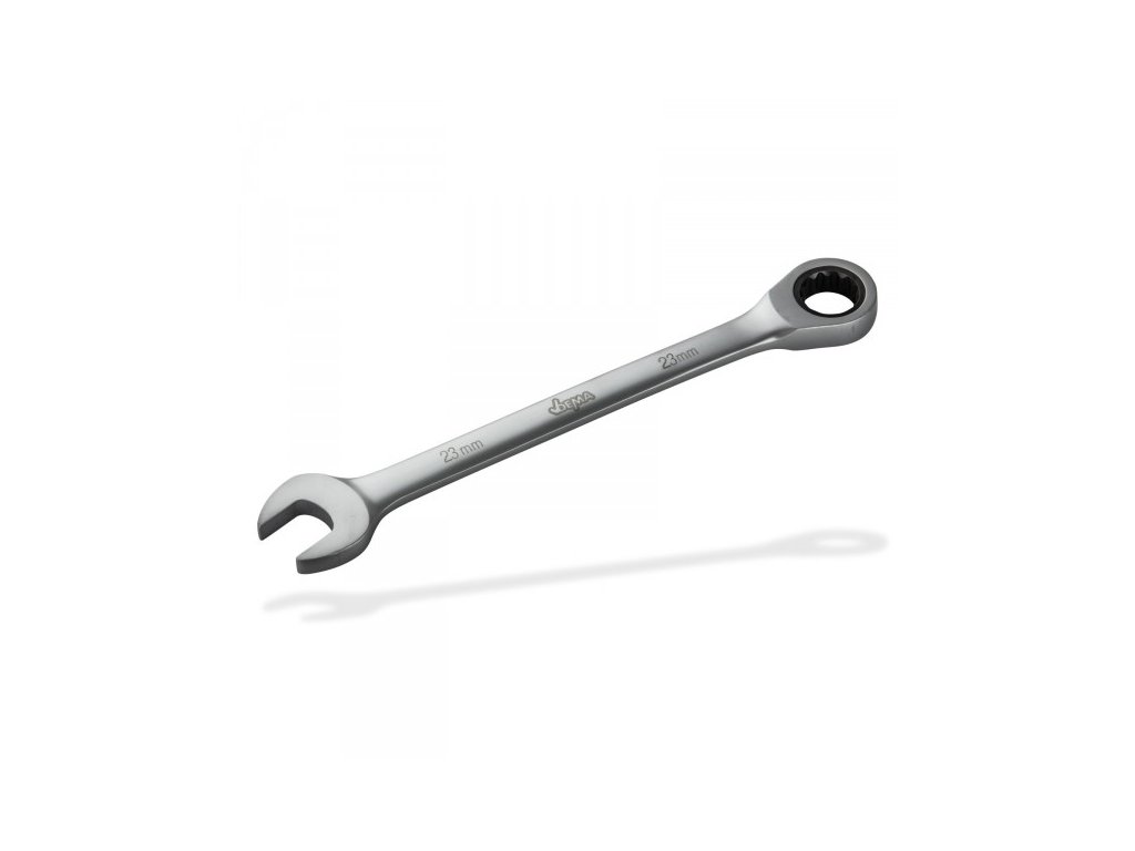 Očkovo-vidlicový kľúč s račňou z kvalitnej chrómovo-vanádiovej ocele. Materiál: chrómovo-vanádiová oceľ